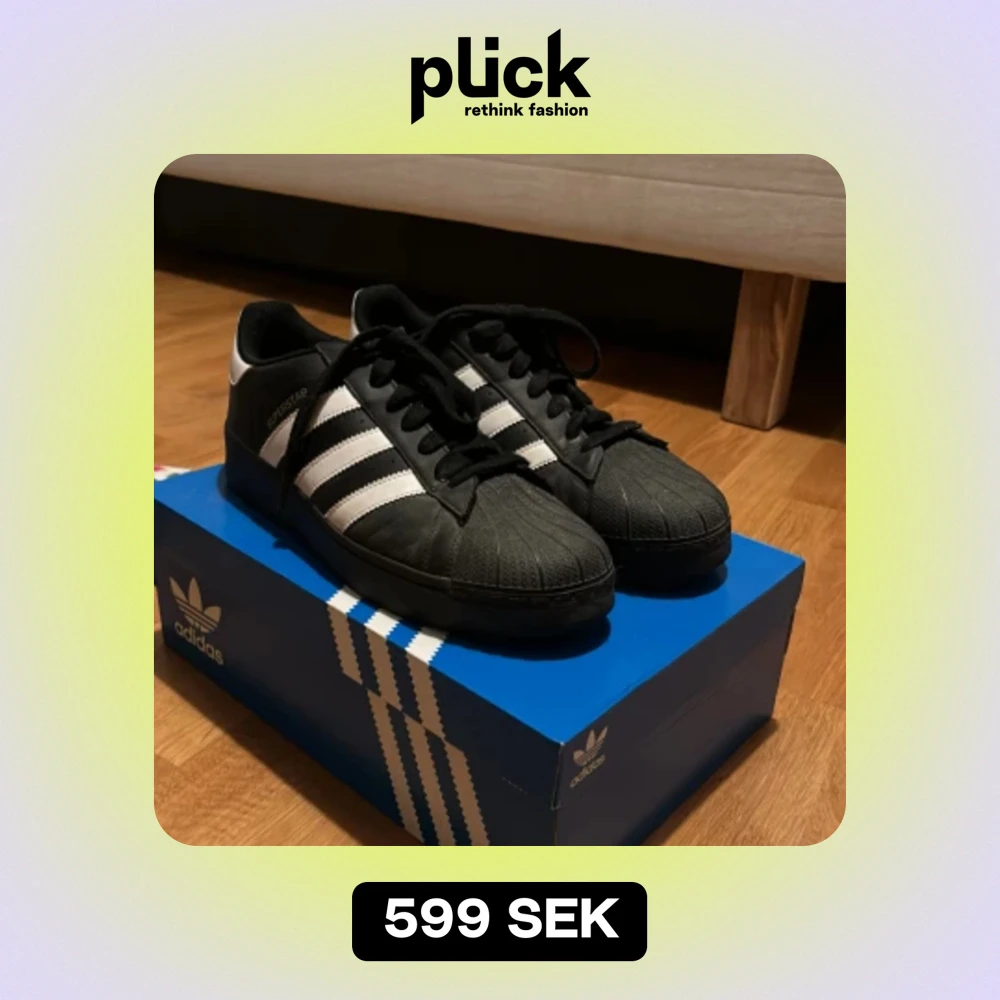 Ett par svarta Adidas Superstar sneakers med vita detaljer och de klassiska tre ränderna på sidorna. Skorna har snörning och Adidas-logotypen på hälen. Utöver det är skorna sparsamt använda och inga fel på skorna. Köptes från Zalando för cirka 1300kr