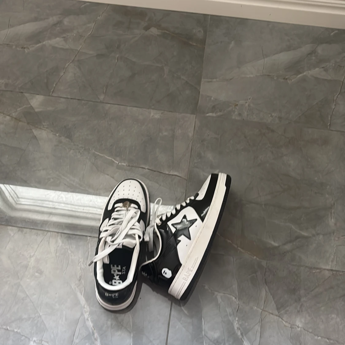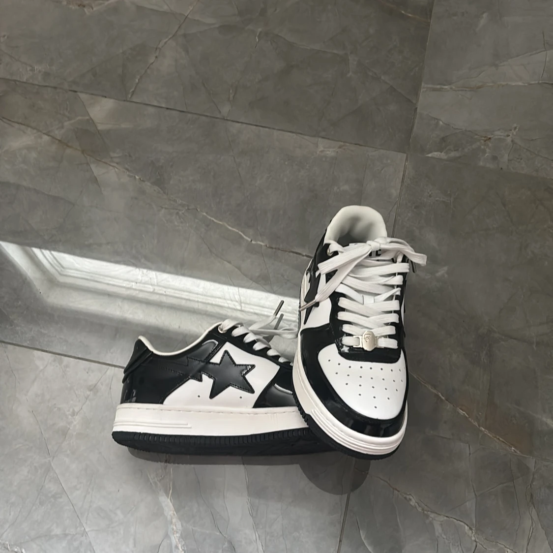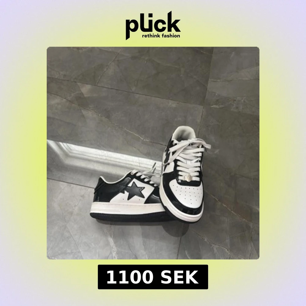 Säljer ett par Bape Sta sneakers i svart och vitt med klassisk stjärndesign på sidan. Skorna har snörning, rund tå och platt sula. Ovandelen är i glansigt syntetmaterial och de har tydliga Bape-loggor på plös och häl. Perfekta för dig som gillar streetwear. Aldrig använda, BOX FÖLJER EJ MED!!! Priset är ej hugget i sten.