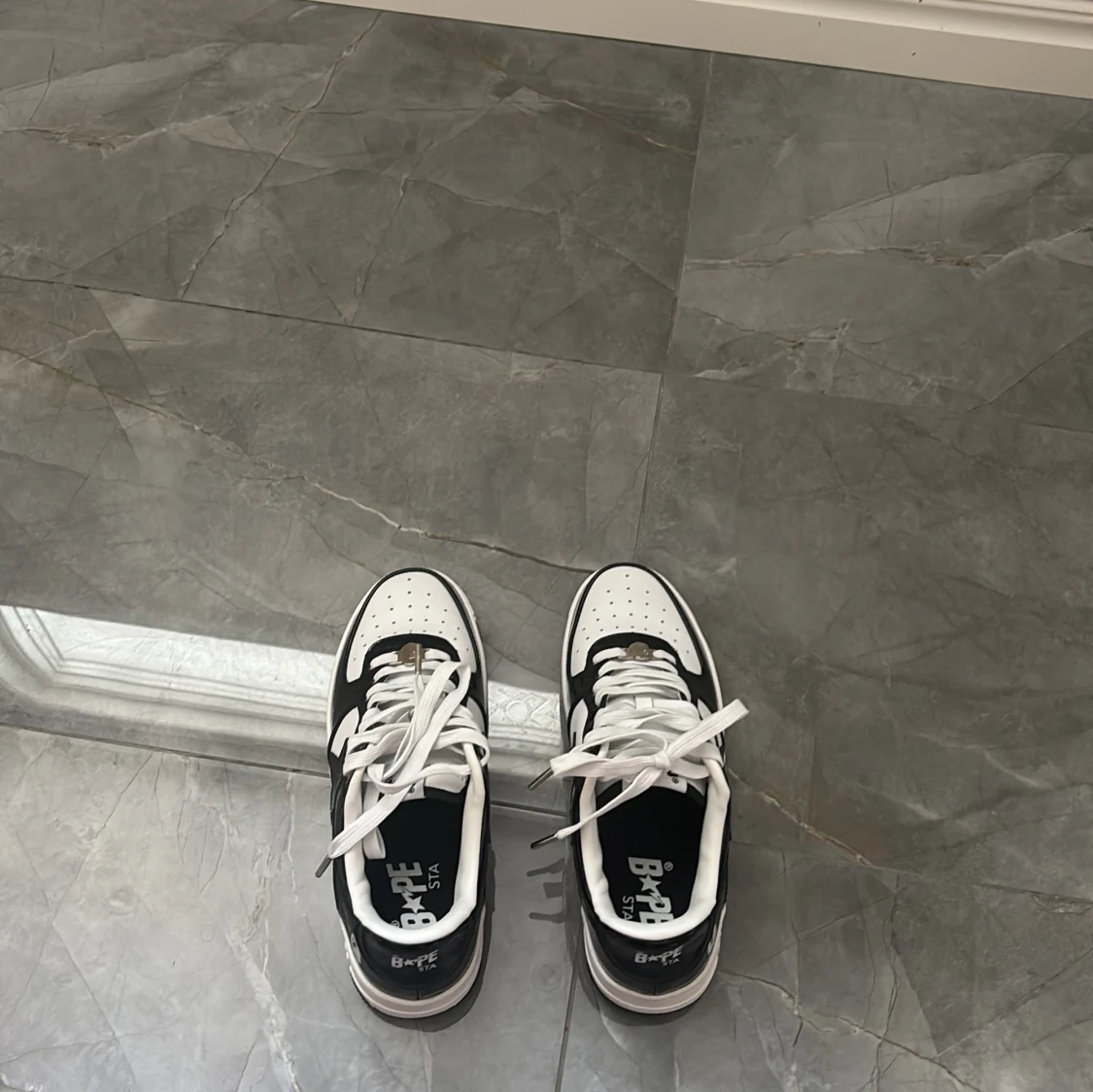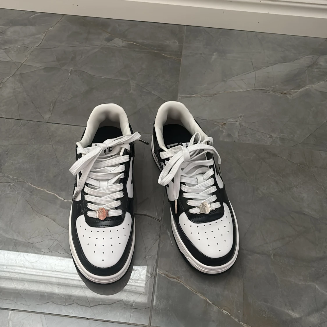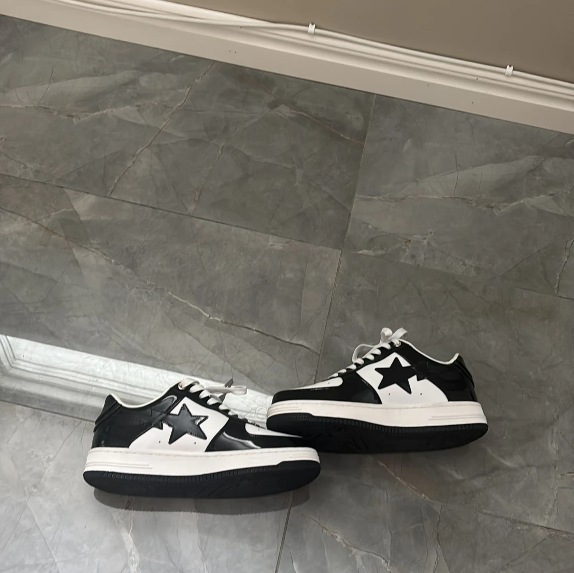 Säljer ett par Bape Sta sneakers i svart och vitt med klassisk stjärndesign på sidan. Skorna har snörning, rund tå och platt sula. Ovandelen är i glansigt syntetmaterial och de har tydliga Bape-loggor på plös och häl. Perfekta för dig som gillar streetwear. Aldrig använda, BOX FÖLJER EJ MED!!! Priset är ej hugget i sten.
