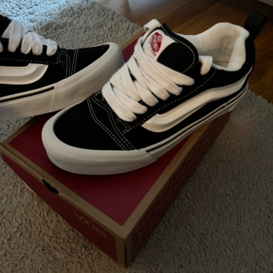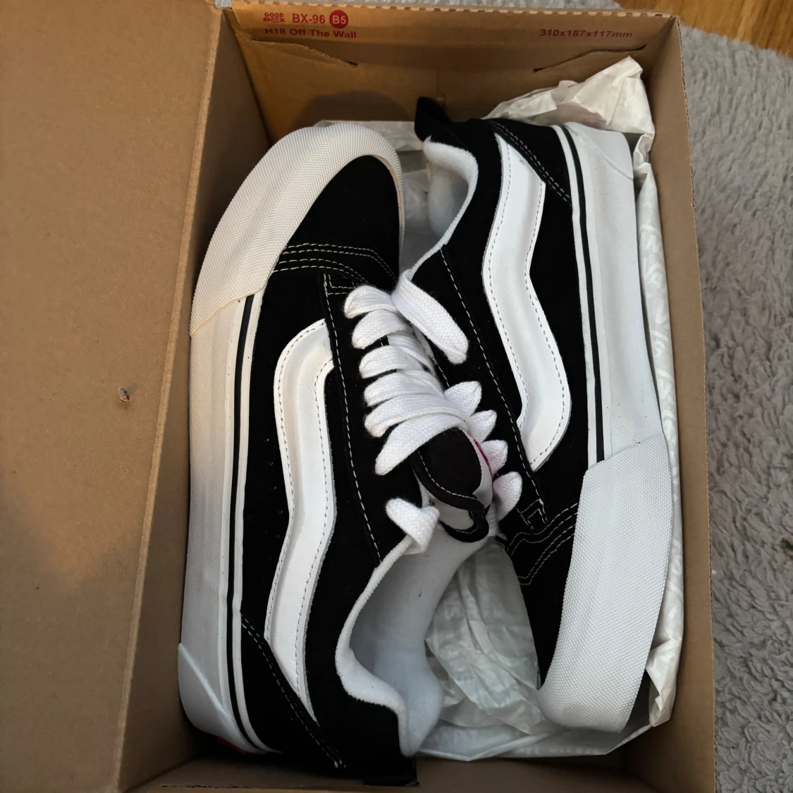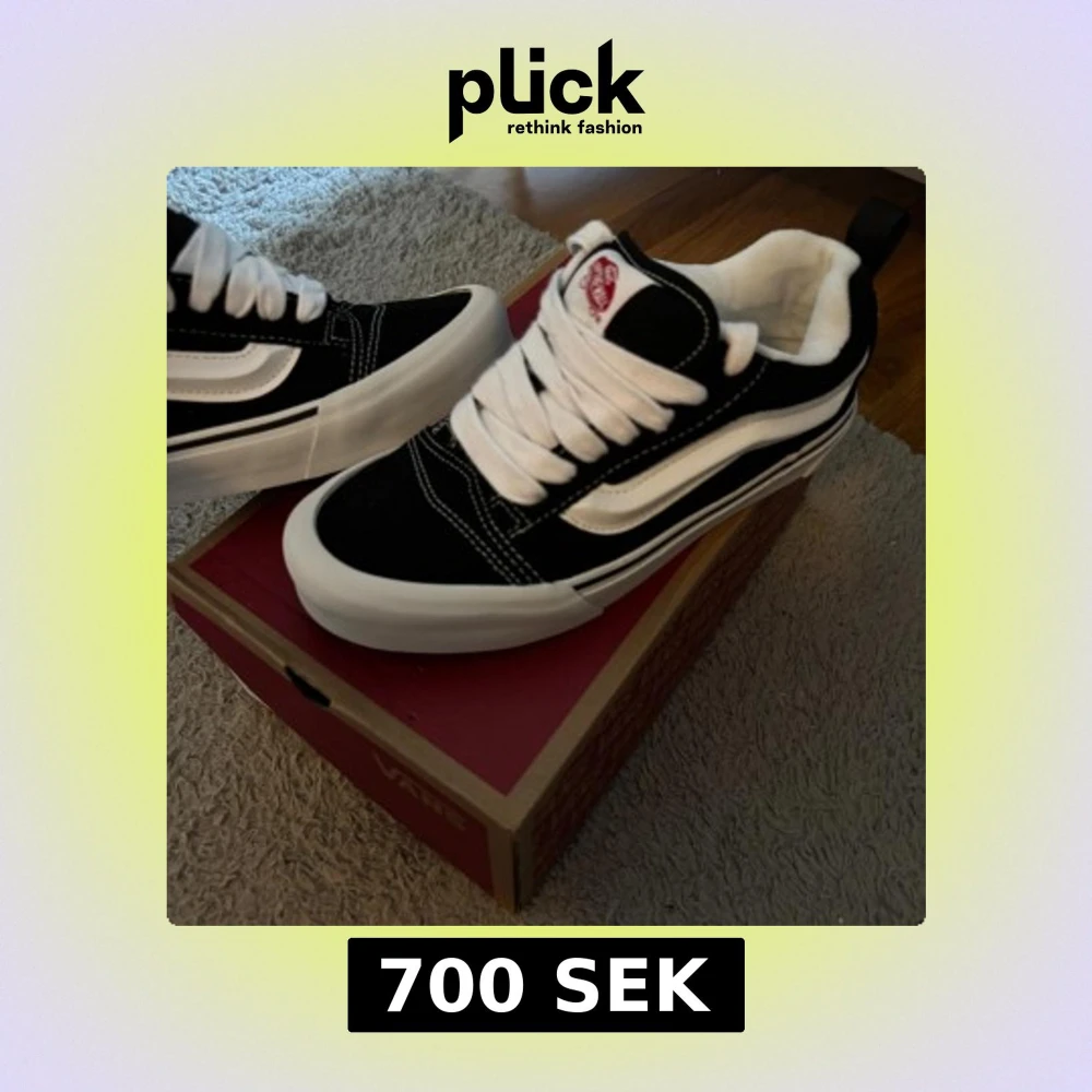 Klassiska Vans Old Skool sneakers i svart och vitt med ikonisk sidorand. Skorna har vit platt sula, snörning och kontrastsömmar. Ovandelen är i mocka och canvas för en skön och cool look. Perfekta för dig som gillar streetstyle och skatekänsla. Aldrig använda 38/39strlk