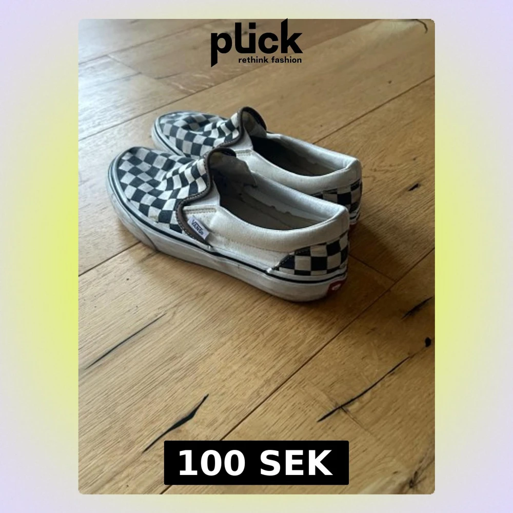 Säljer ett par klassiska Vans slip-on sneakers med svartvitt rutigt checkerboard-mönster. Skorna har rund tå, platt sula och är tillverkade i canvas med vita detaljer runt sulan. Perfekta för dig som gillar streetstyle och vill ha en ikonisk look.