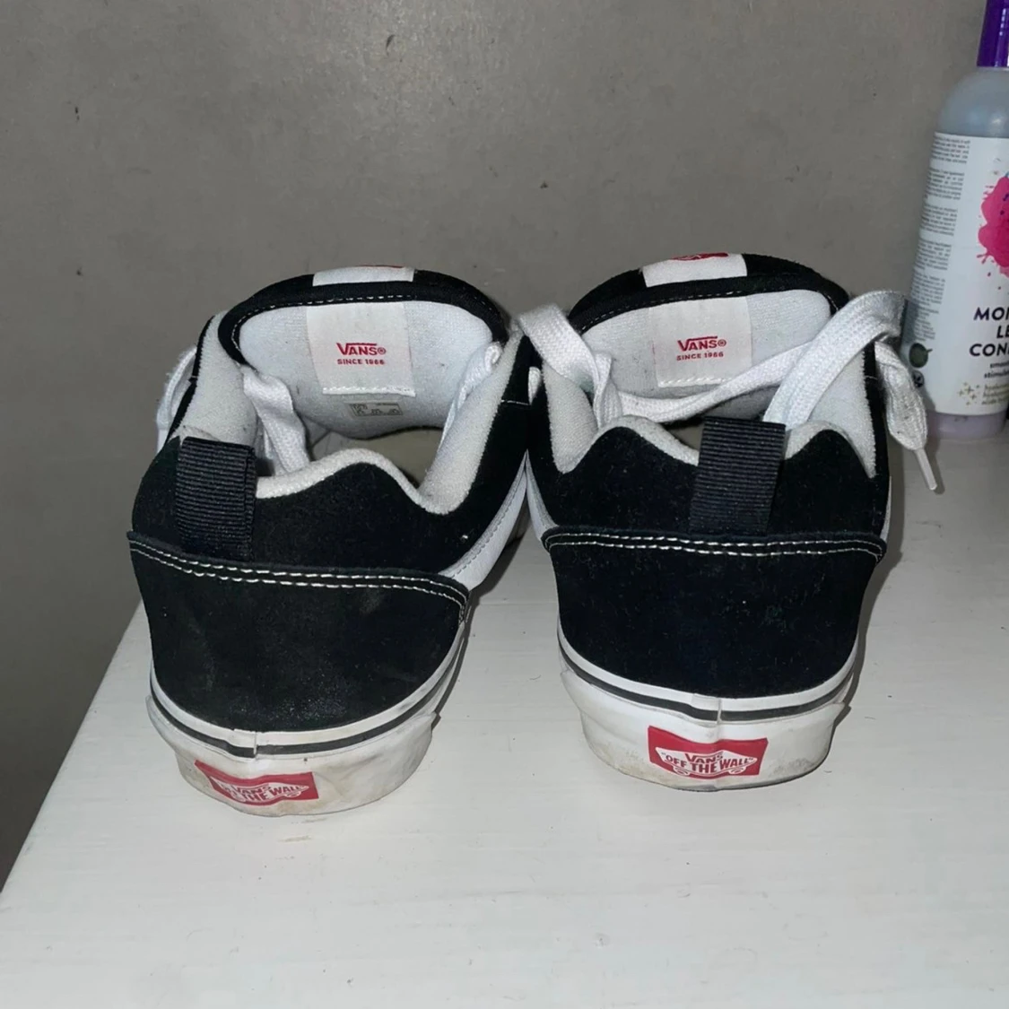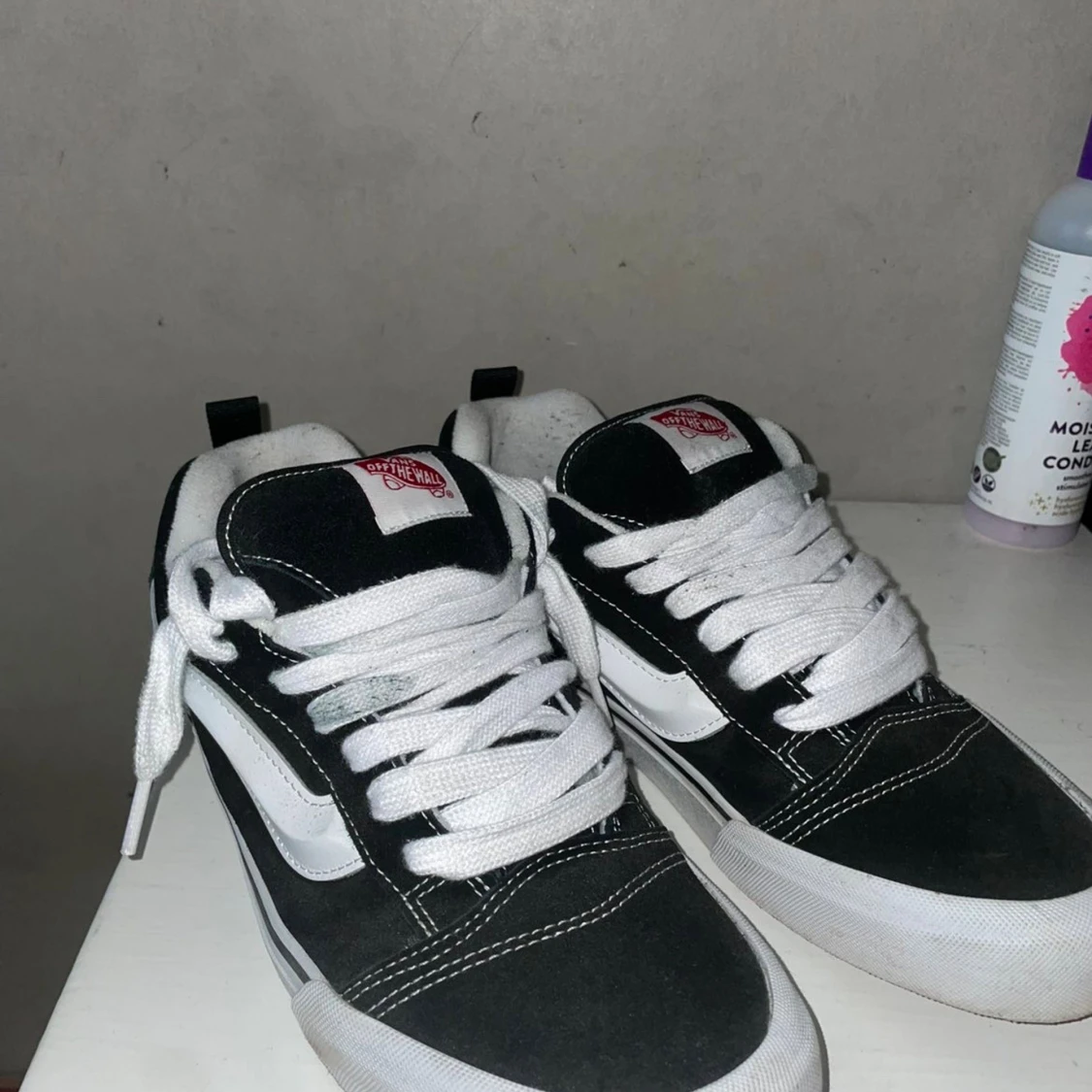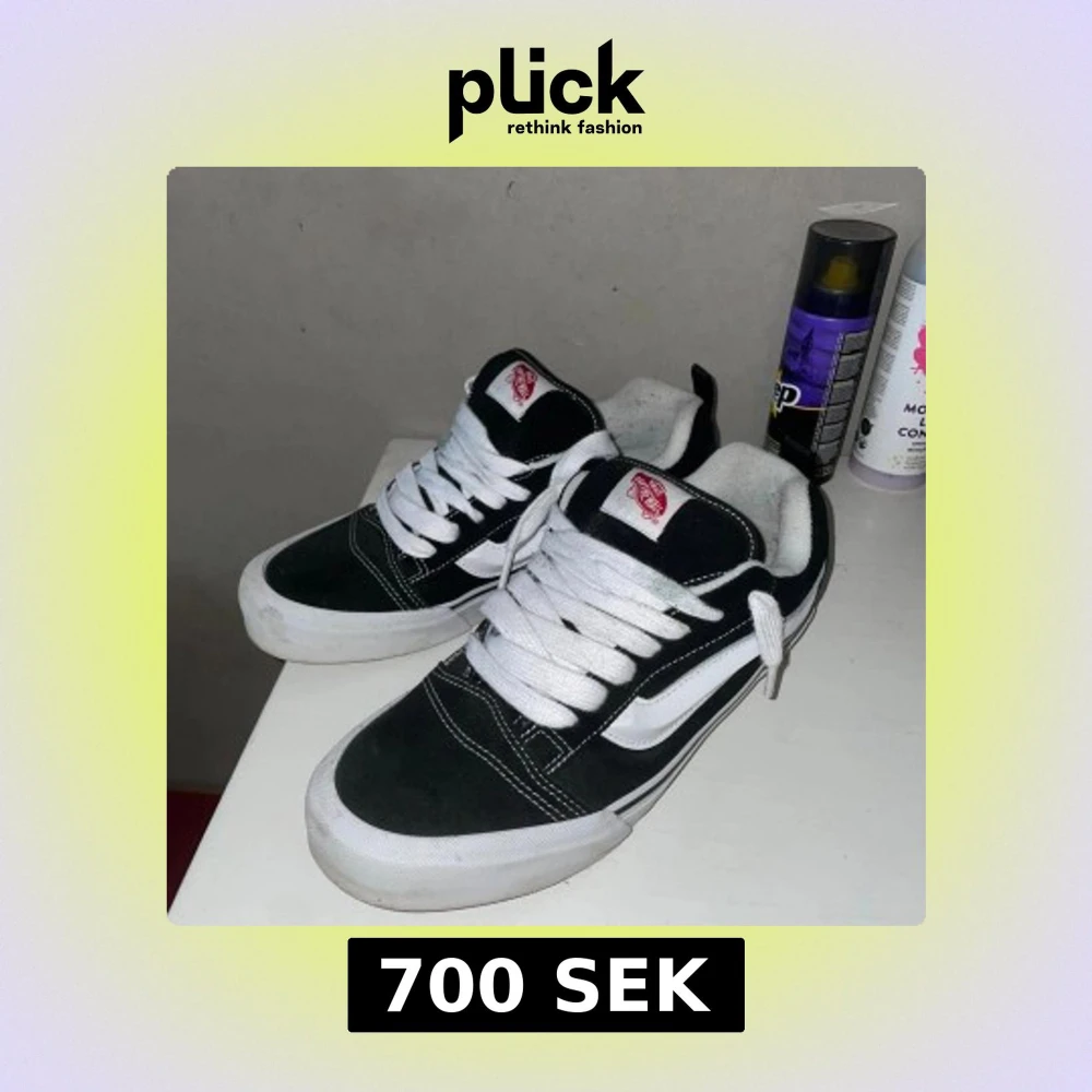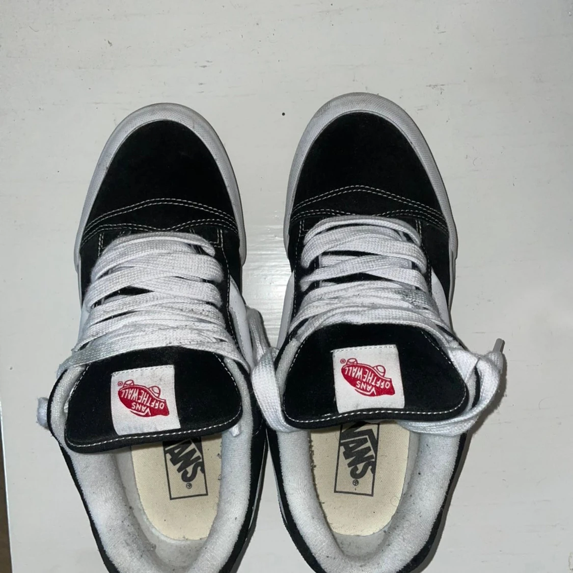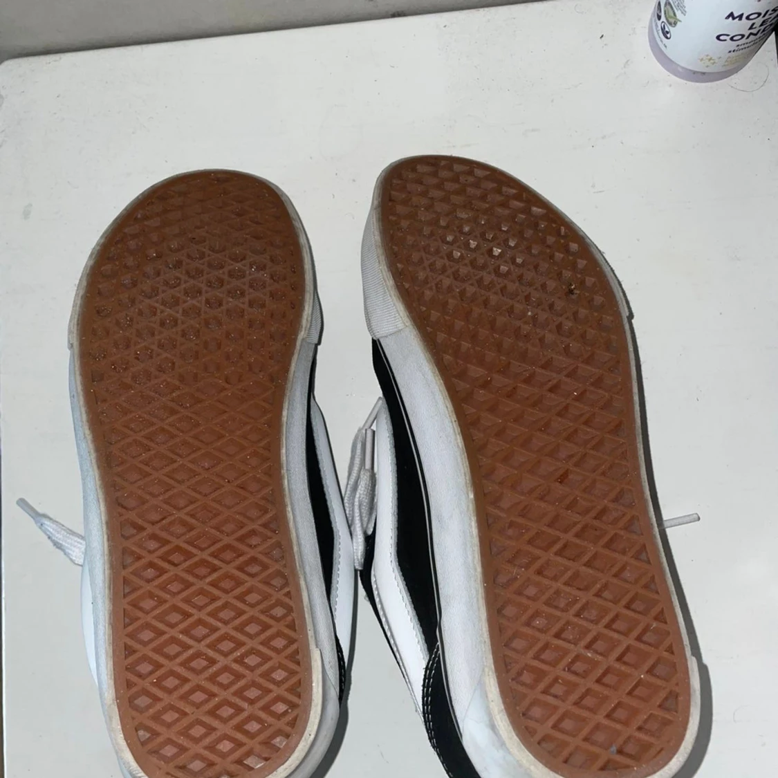 Säljer ett par klassiska Vans sneakers i svart och vitt med den ikoniska sidostripen. Skorna har vit snörning, rund tå och platt sula med gummisula i brunt. Materialet är en mix av canvas och mocka, och de har en cool streetstil med 'Off The Wall'-logga på tungan.