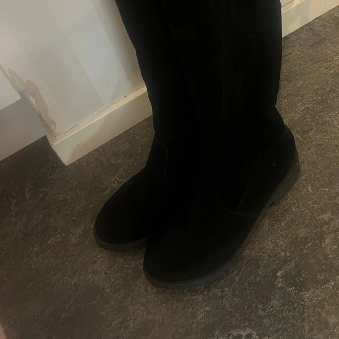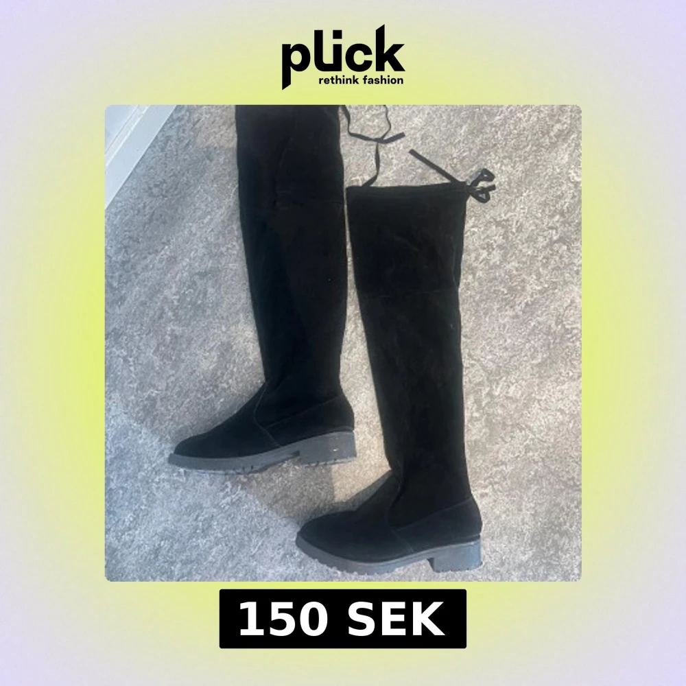 Säljer ett par svarta overknee stövlar i mjuk mocka med platt sula och rund tå. Stövlarna har snörning upptill som detalj och grov yttersula för extra grepp. Perfekta för att lyfta din outfit under kyliga dagar.