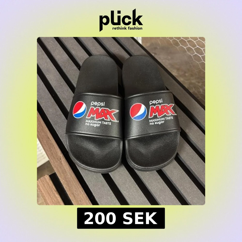 Svarta sandaler med bred rem över foten och Pepsi Max-logga i rött, blått och vitt. Tillverkade i syntetmaterial med platt sula och öppen tå. Perfekta för chill dagar eller att glida runt i hemma eller på stranden.