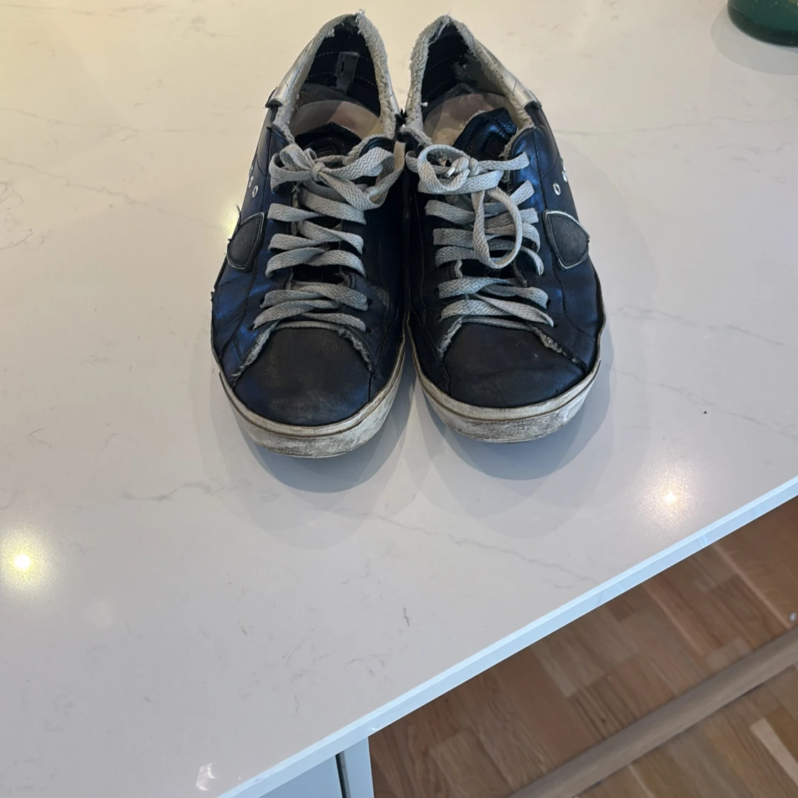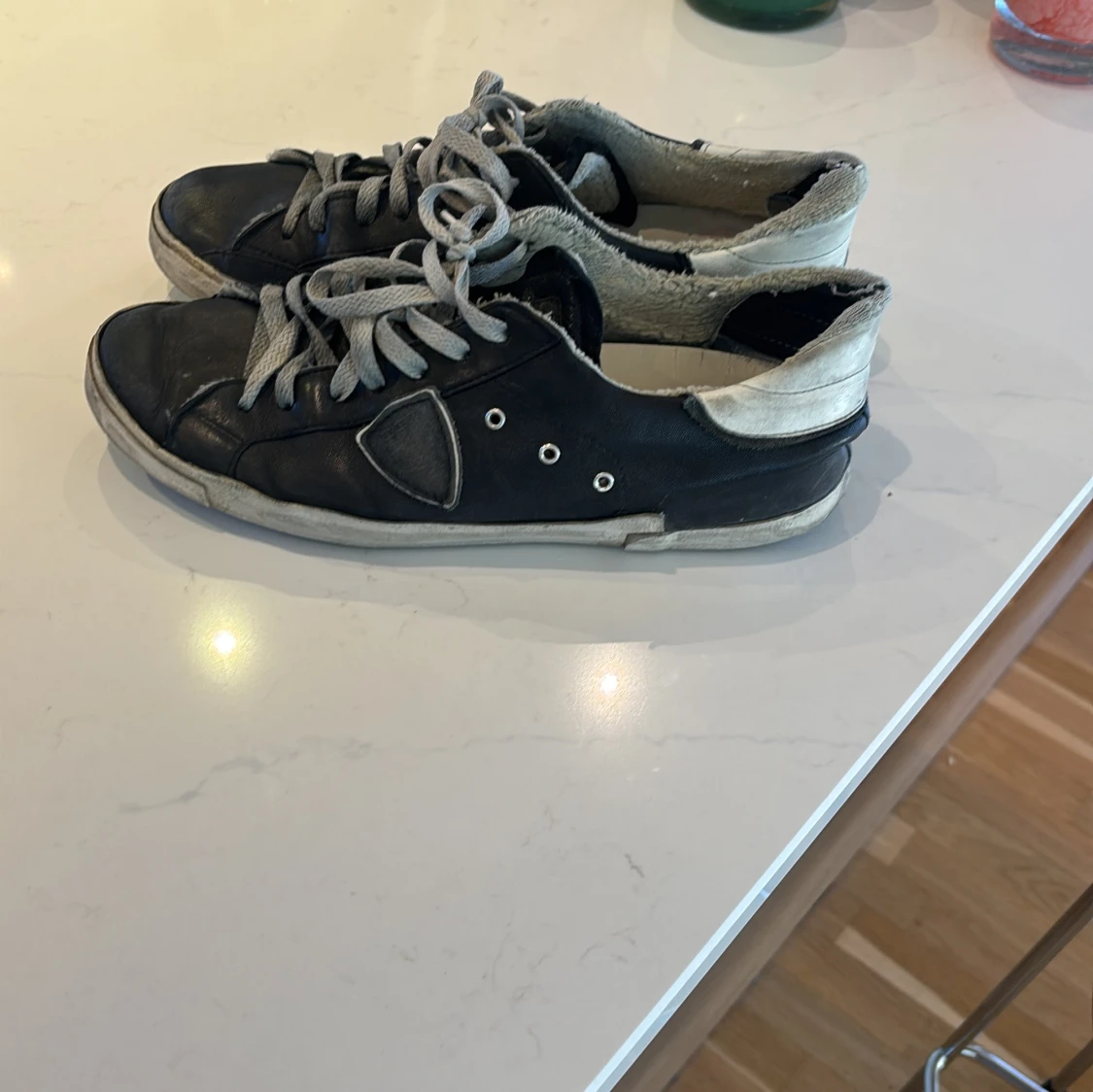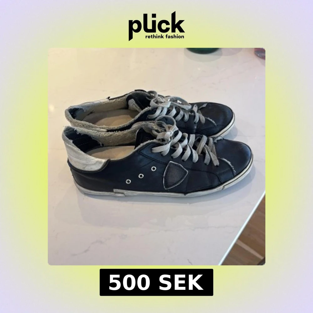 Svarta sneakers med grå snörning och vit/grå häl. Skorna har rund tå, platt sula och flera metallöljetter på sidan. Ovandelen är i skinn och de har en cool, sliten look med kontrasterande detaljer på hälen och sidan. Snygga men använda hör av er vid funderingar. Har en del defekter så skriv för att se dem. Box följer med.