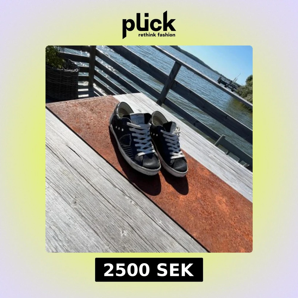 Snygga svarta sneakers från Philippe Model med vita snören och vit sula. Skorna har rund tå och coola detaljer på sidan samt märkets logga under sulan. Materialet är skinn och insidan är ljus. Perfekta för dig som gillar streetstyle och vill ha något unikt på fötterna.