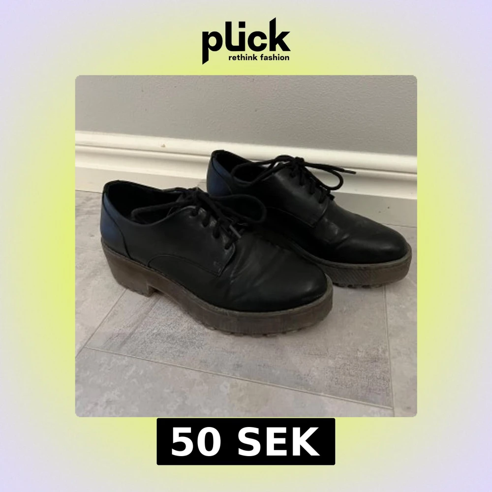 Säljer ett par svarta platåskor i skinnimitation med snörning. Skorna har rund tå och en rejäl platt sula som ger extra höjd. Perfekta för dig som vill ha en stilren men edgy look.