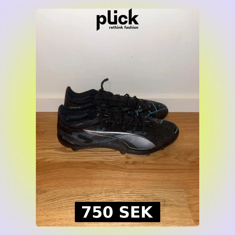 Säljer ett par svarta fotbollsskor från Puma med snygga blå linjer och silvriga Puma-loggor på sidorna. Skorna har snörning och platt sula med dobbar för gräsplan. Ovandelen är i syntetmaterial och designen är riktigt sportig och modern.