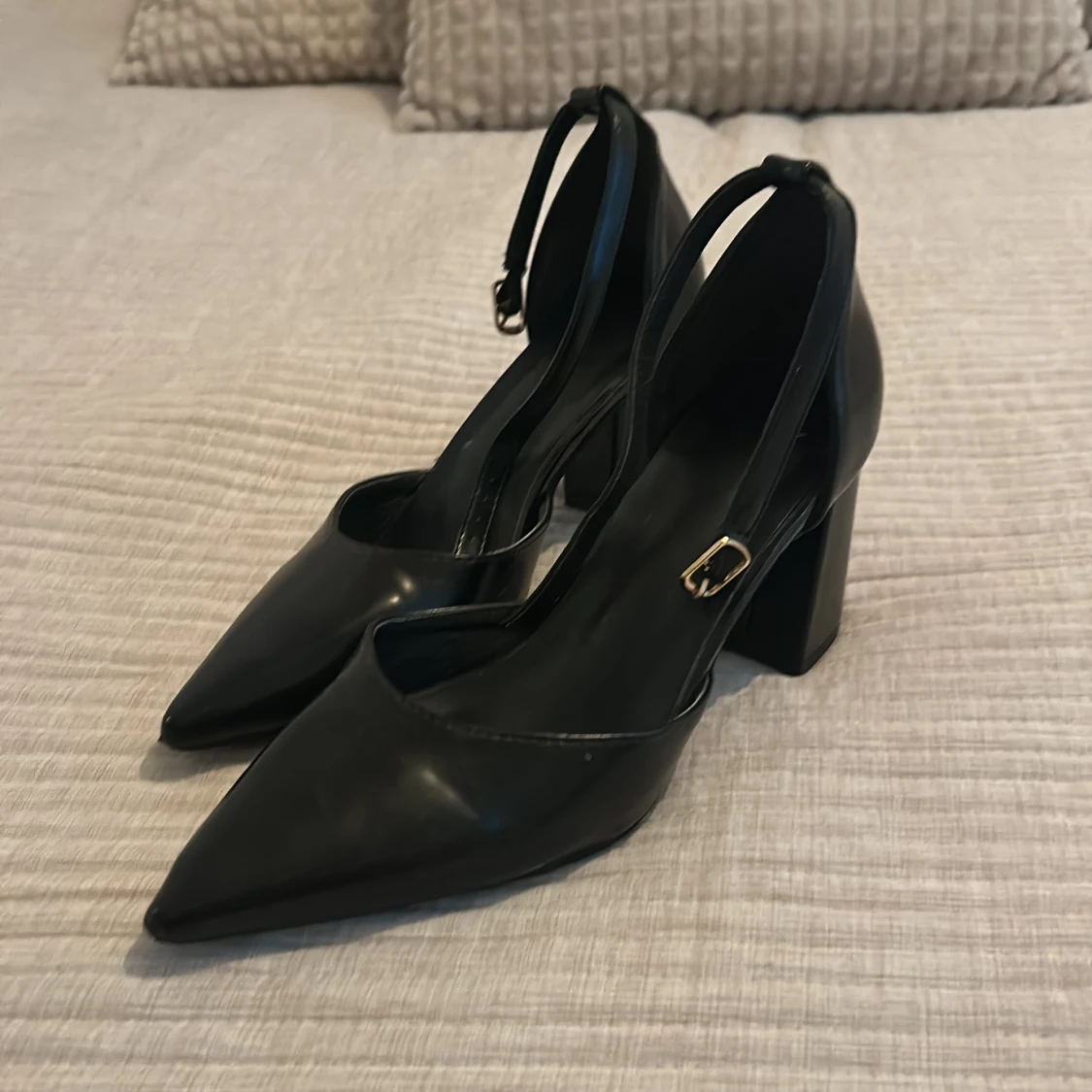 Stilrena svarta pumps med spetsig tå, bred blockklack och smal ankelrem med guldfärgat spänne. Skorna är i slätt skinnliknande material och passar perfekt till dig som vill ha en klassisk men edgy look.