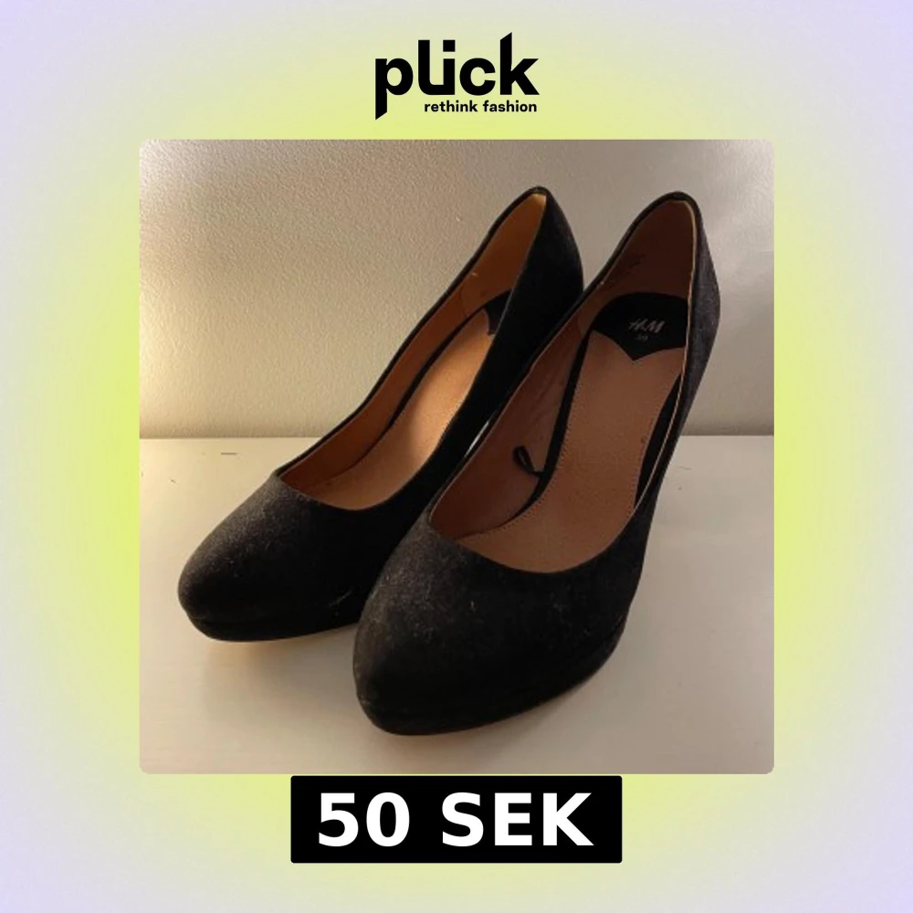 Säljer ett par klassiska svarta pumps från H&M i storlek 39. Skorna har rund tå, hög blockklack och är klädda i mjuk mockaliknande material. Perfekta för dig som vill ha en stilren och tidlös look med lite extra höjd. Lite slitna på undersidan men påverkar inte skon särskilt mycket.