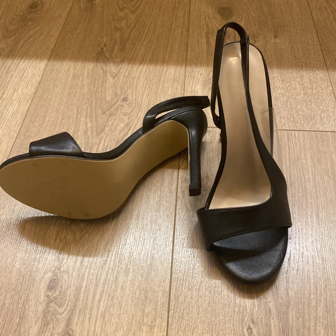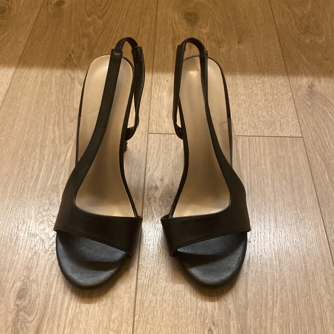 Snygga svarta pumps med öppen tå och hög klack. Modellen har en stilren design med smal rem runt hälen och bred rem över foten. Skorna har en rundad framdel och är tillverkade i ett slätt material som ger en elegant look.