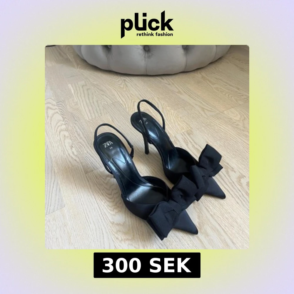 Eleganta svarta pumps från Zara med spetsig tå och hög klack. Skorna har en stilren design med en stor dekorativ rosett framtill. Klackens höjd är 10 cm. Använda 2 gånger.