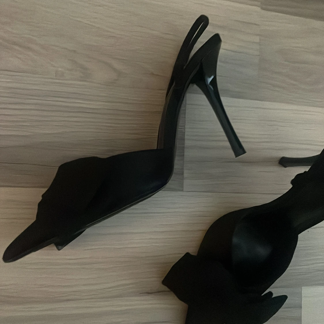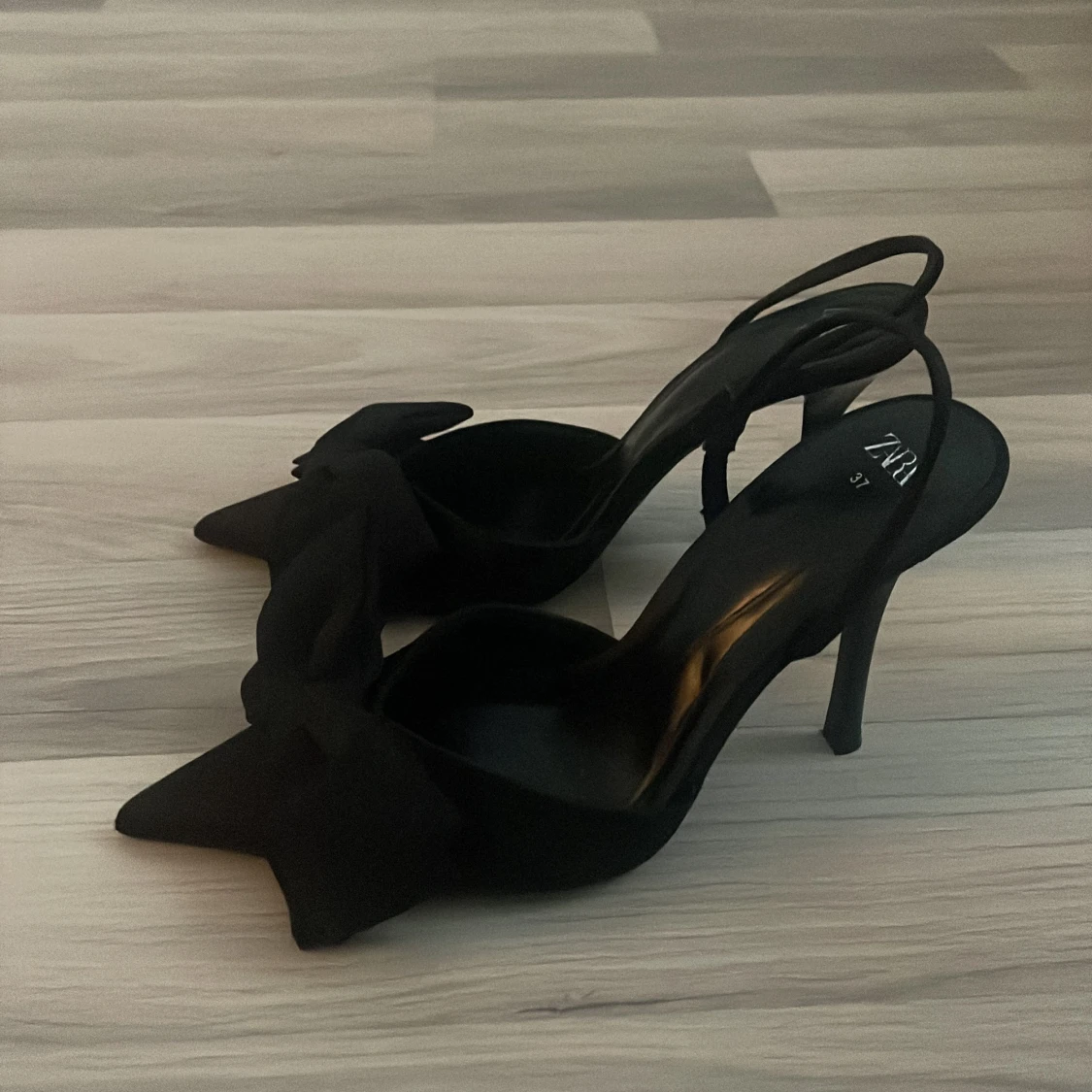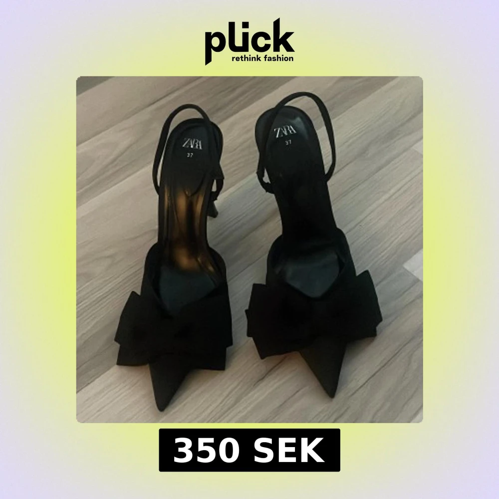 Stilrena svarta pumps från Zara med spetsig tå och hög klack. Skorna har en elegant rosett framtill och smal rem runt hälen. Perfekta för dig som vill sticka ut med en klassisk men trendig look.
