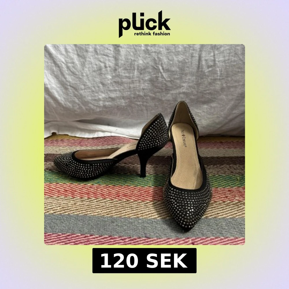 Snygga svarta pumps från The Country med spetsig tå och täckta av små silverglittriga nitar. Skorna har en elegant låg klack och är perfekta för dig som vill sticka ut. Materialet är troligtvis syntet och de har en klassisk, stilren form.