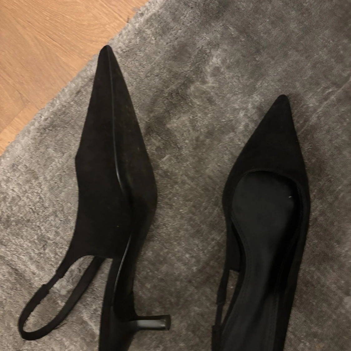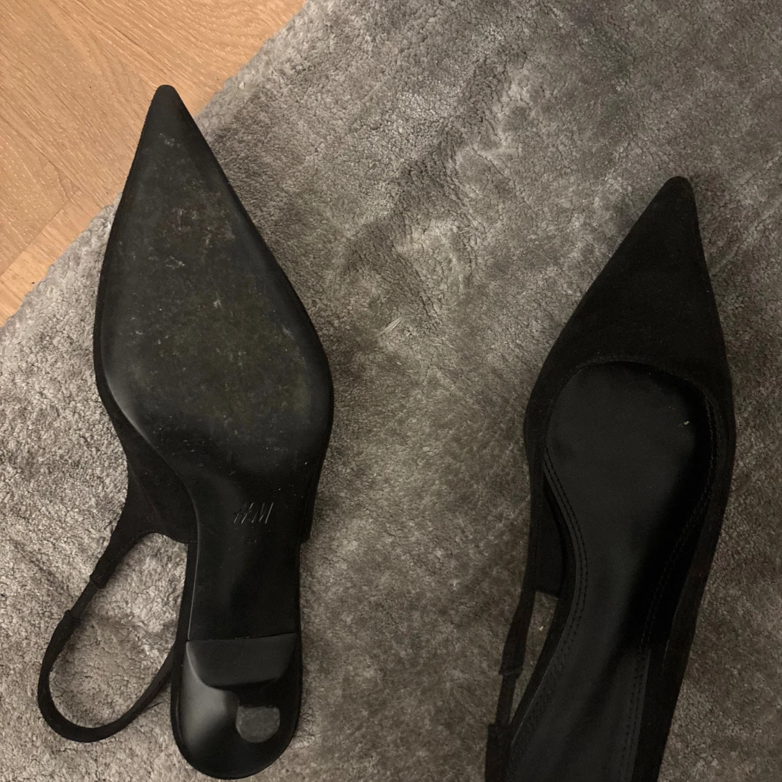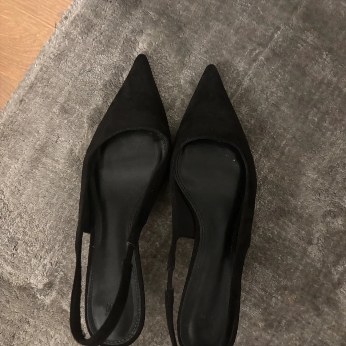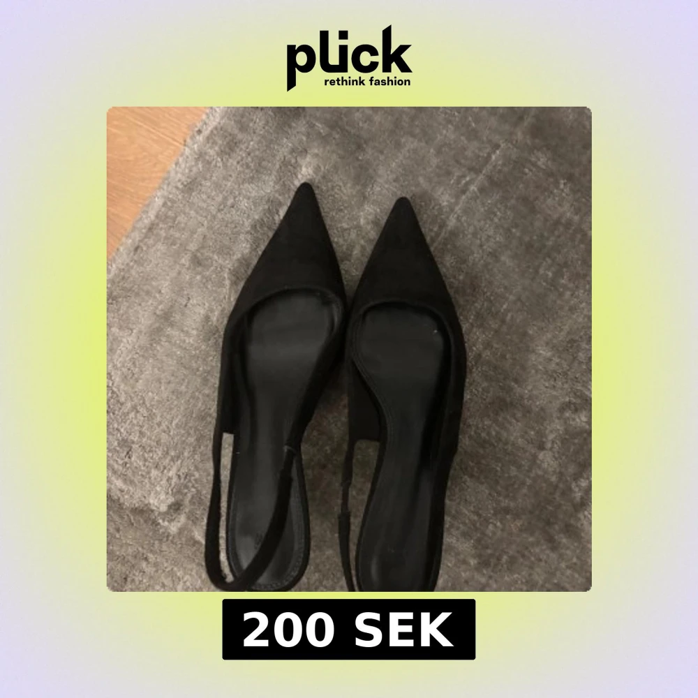 Svarta pumps från H&M med smal klack och spetsig tå. Skorna har en öppen häl med smal rem runt ankeln och är tillverkade i mockaliknande material. Perfekta för dig som gillar en stilren och elegant look.
