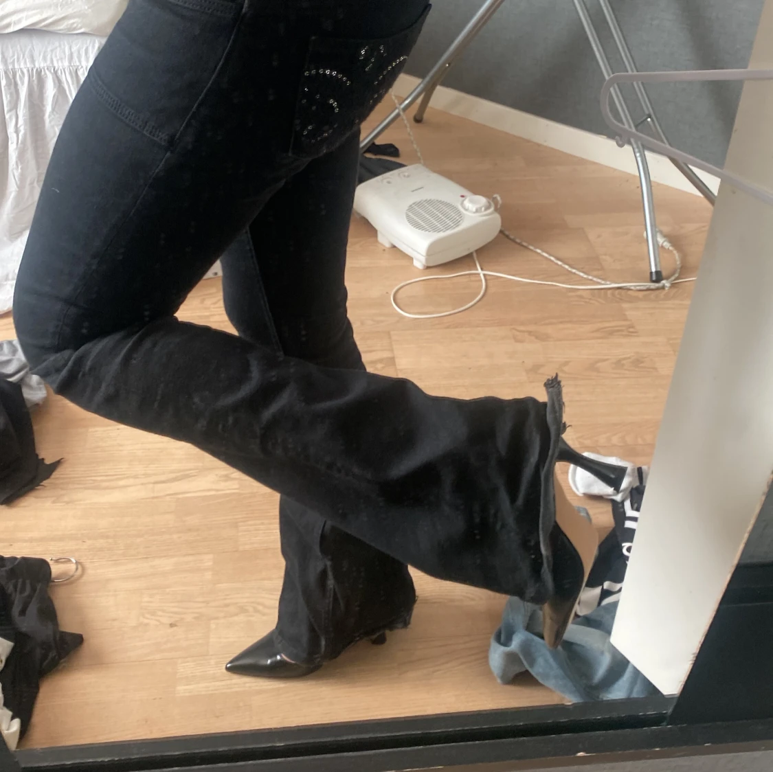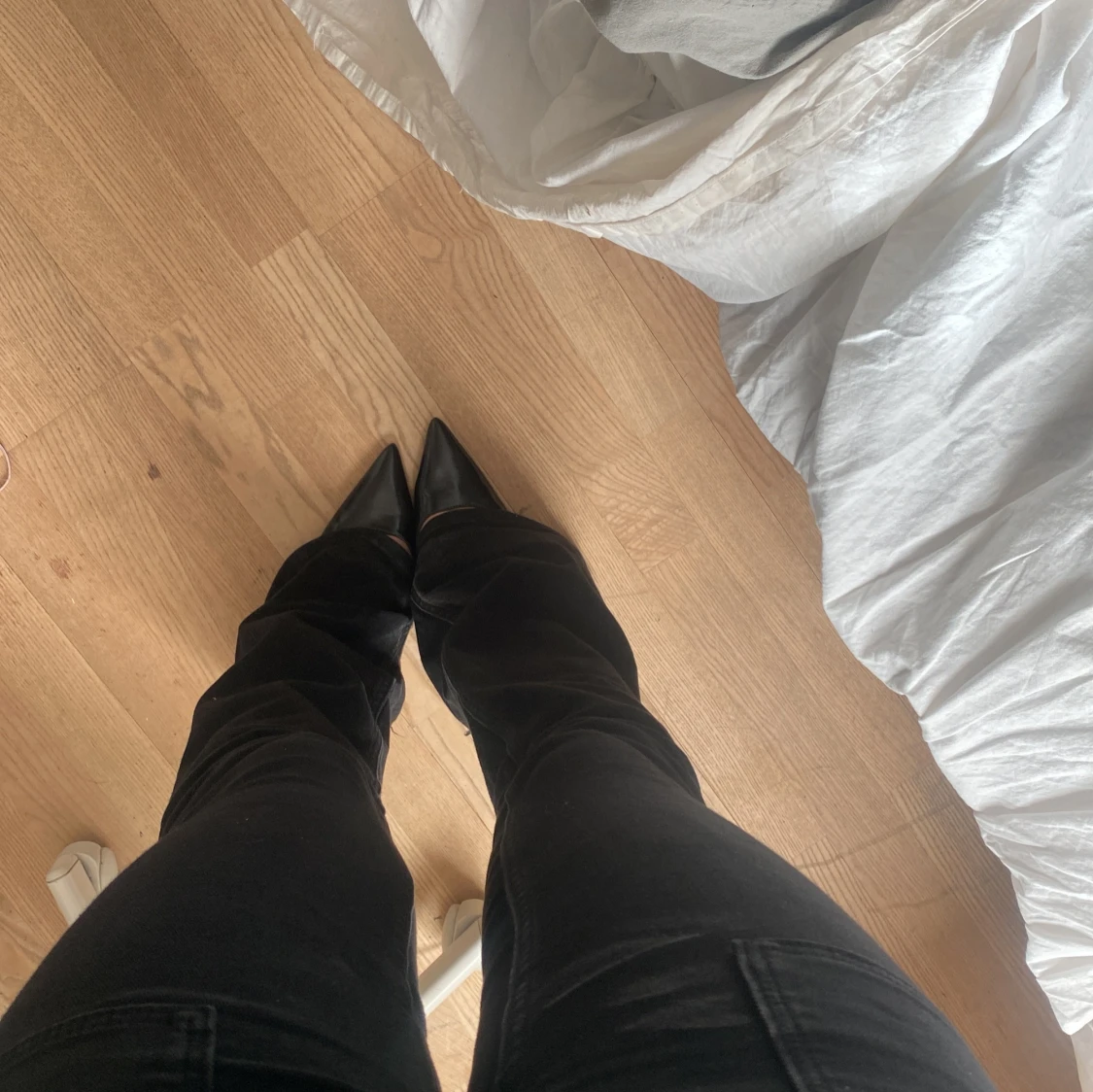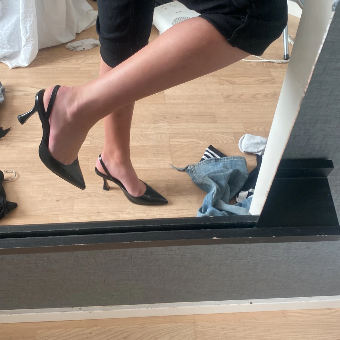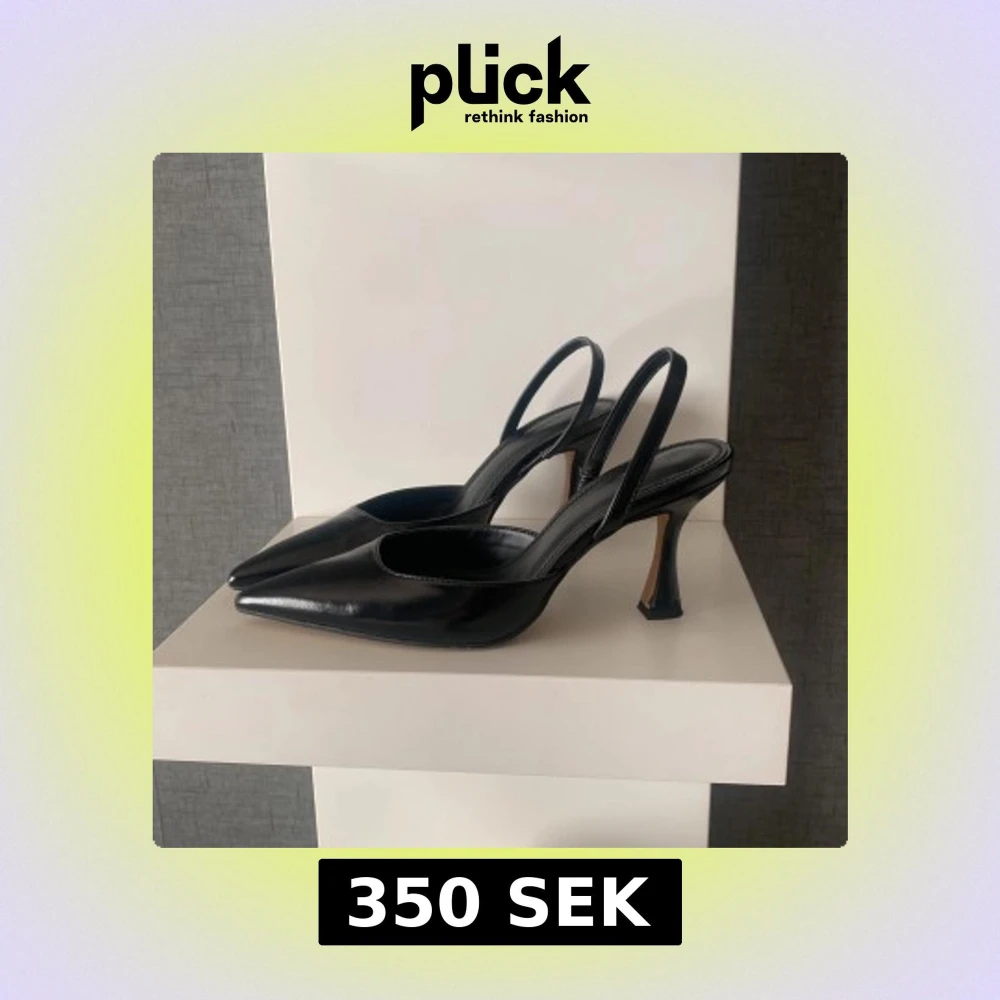 Säljer ett par svarta pumps i skinnimitation med elegant spetsig tå och smal klack. Skorna har öppen häl med smal rem som ger en stilren och trendig look. Perfekta för dig som vill ha en klassisk men edgy vibe till outfiten. Knappt använda