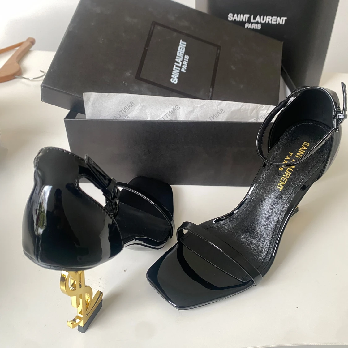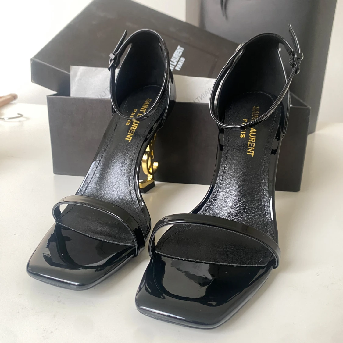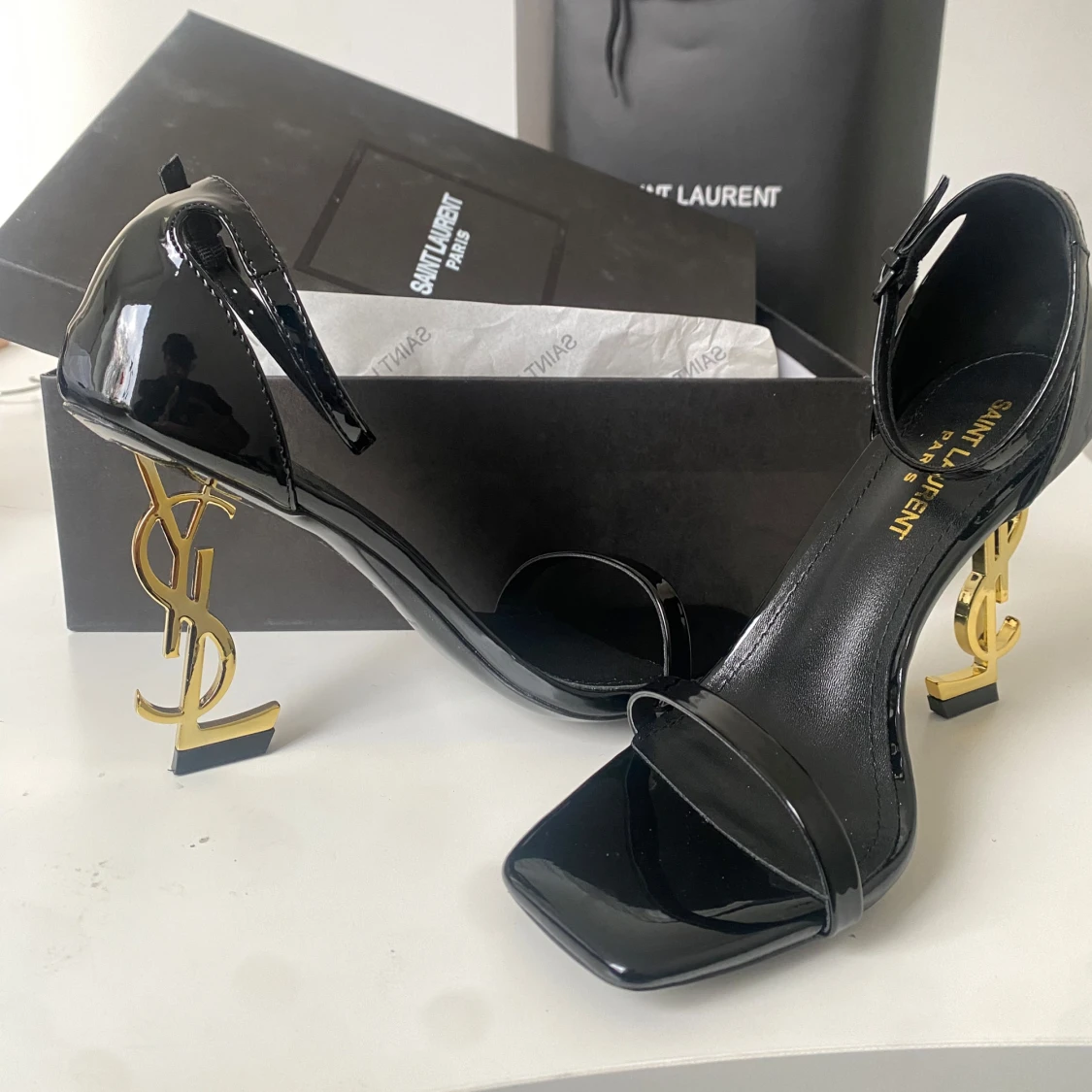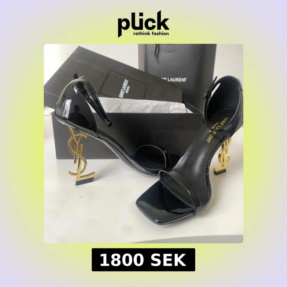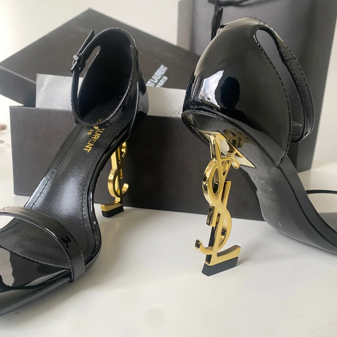 Säljer ett par svarta klackar från Saint Laurent i lackat skinn med ikonisk guldig YSL-logga som klack. Skorna har öppen tå, smal rem över foten och runt vristen samt fyrkantig tå. Perfekta för dig som vill sticka ut med lyxig och trendig vibe.