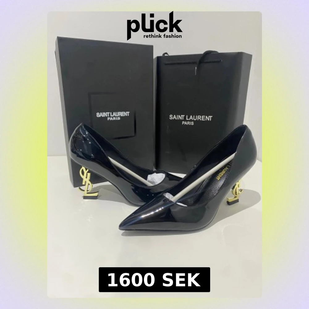 Säljer ett par svarta pumps från Saint Laurent med glansig finish och spetsig tå. Klacken är i guld och formad som YSL-loggan, vilket ger en lyxig vibe. Skorna är tillverkade i skinn och har en elegant siluett som verkligen sticker ut.