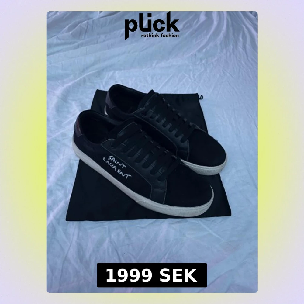 Svarta sneakers från Saint Laurent med vit logga på sidan. Skorna har snörning, rund tå och vit platt sula. Materialmix av skinn och textil ger en lyxig vibe. Perfekt för dig som gillar stilrena och exklusiva sneakers med streetkänsla.nästan helt nya och i super skick, pris är inte hugget i sten!