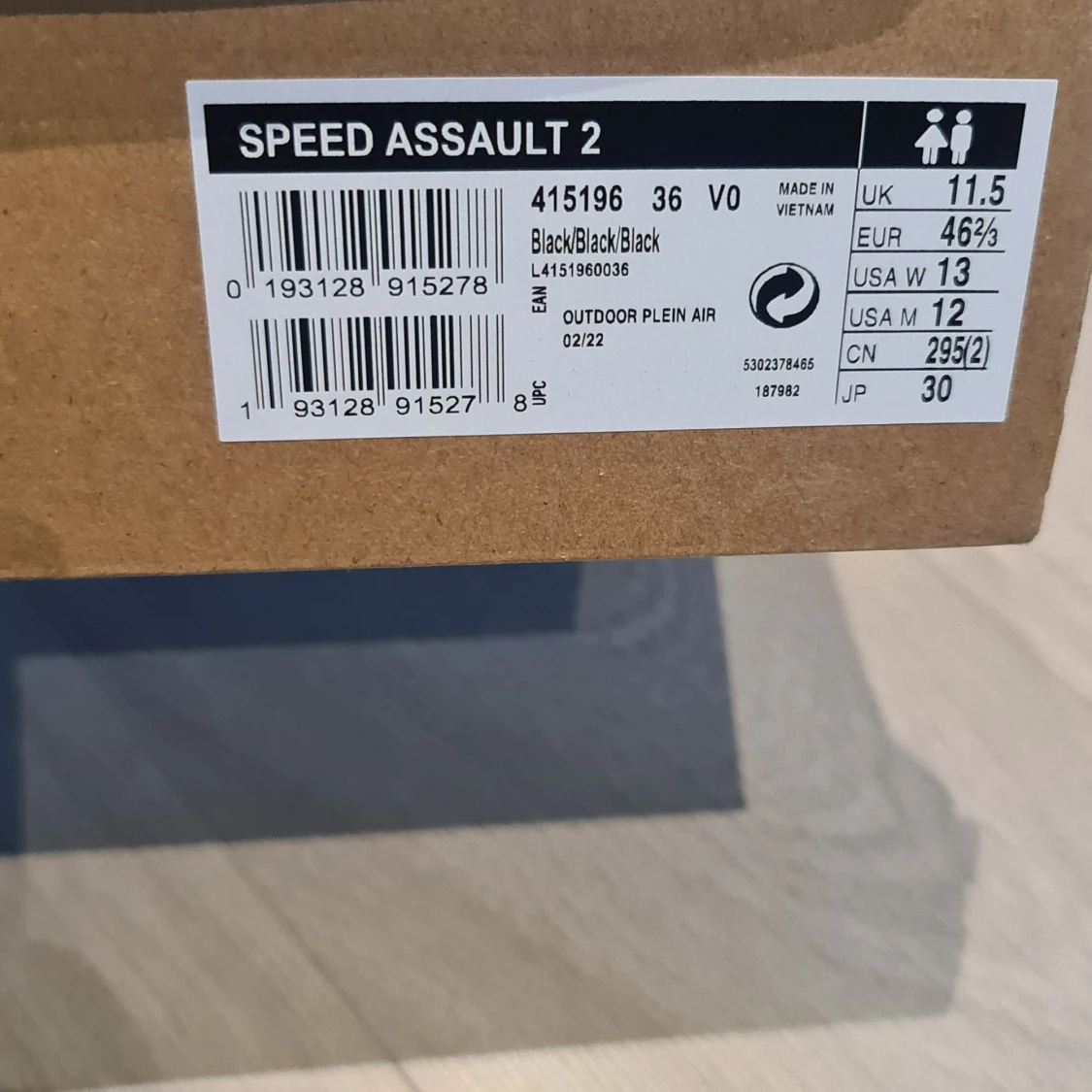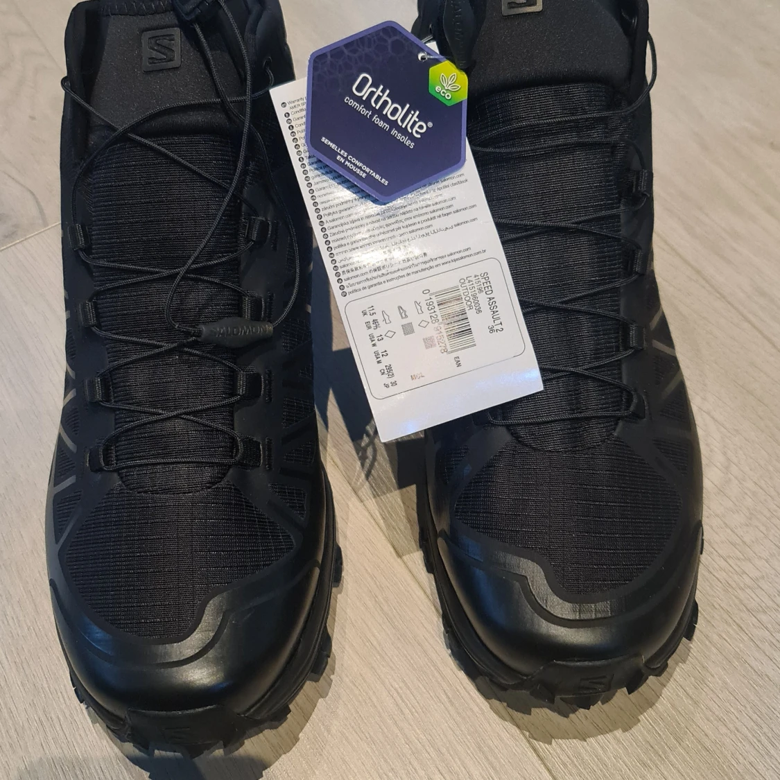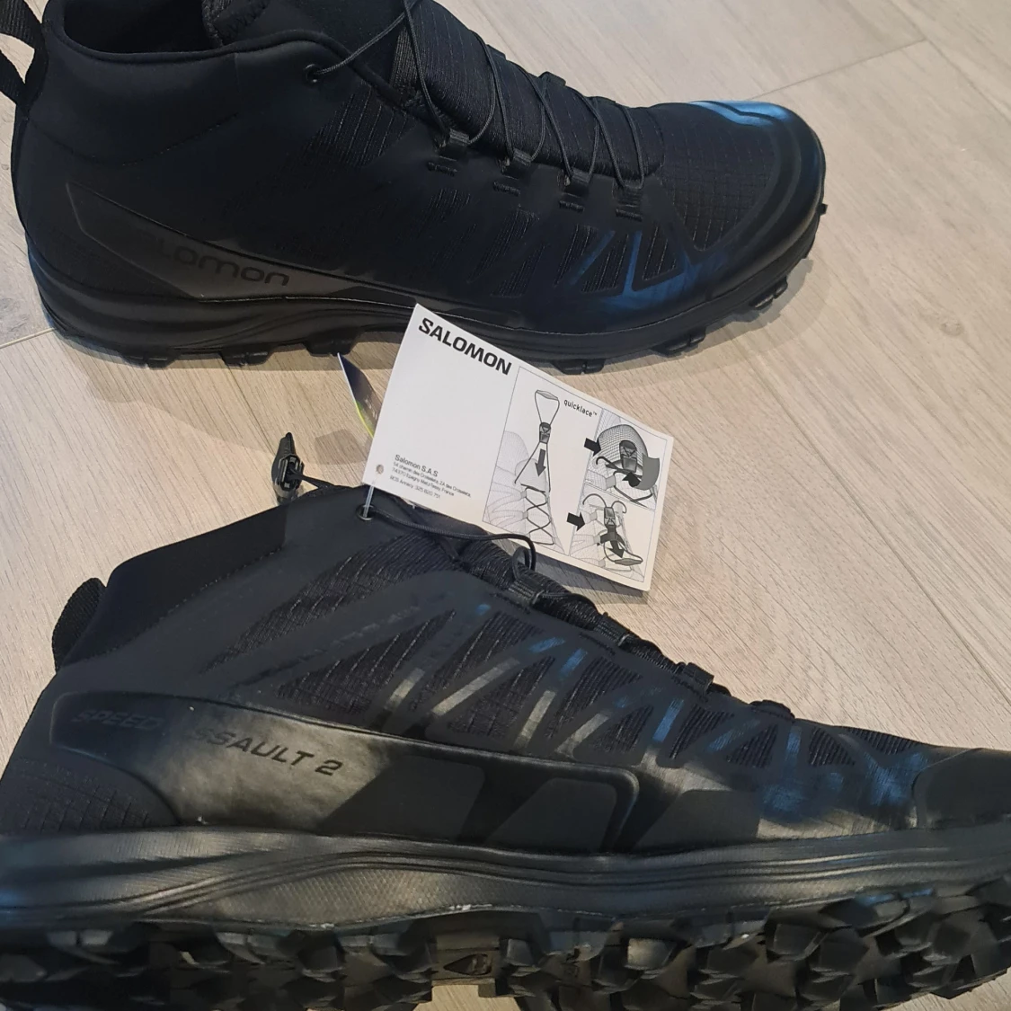 Salomon Speed Assault 2 kängor i helsvart med robust, grovmönstrad sula för extra grepp. Skorna har snörning med snabbspänne och är tillverkade i slitstark syntet med meshpaneler för ventilation. Perfekta för utomhusaktiviteter och äventyr.
