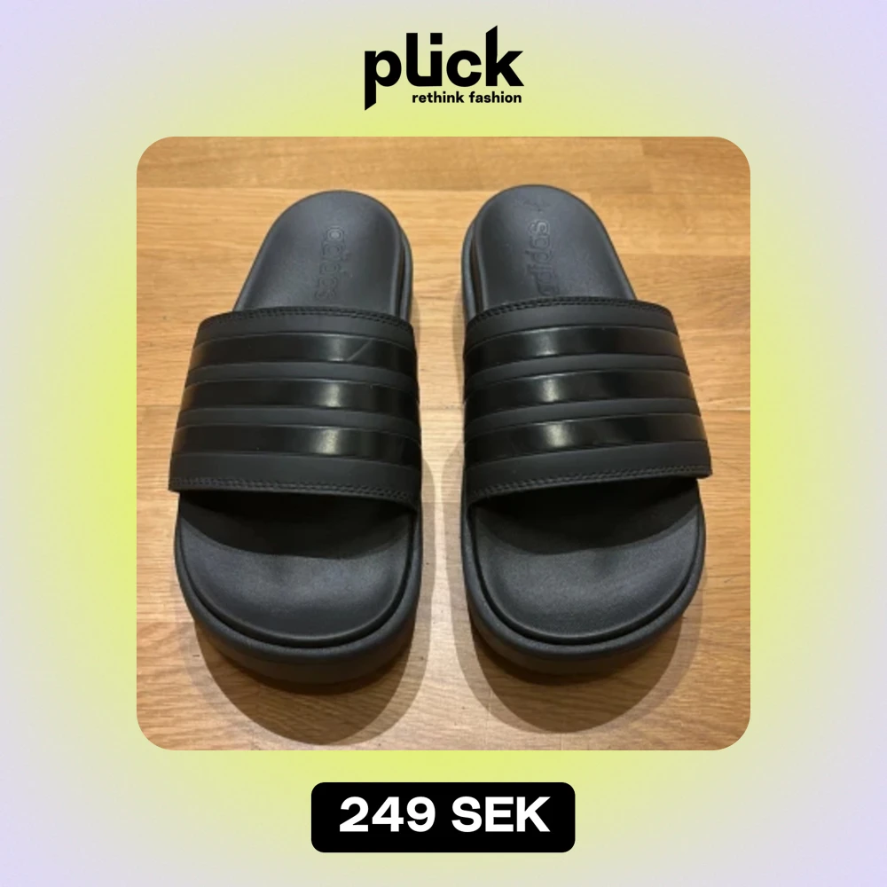 Säljer ett par svarta tofflor från Adidas. De är bekväma och super sköna att ha på och gå i. perfekt för sommaren. De är i nyskick och har en normal passform. Storlek 42 men funkar jättebra för liknande storlekar. Nypris: 619kr Pris: 249kr. Finns det några frågor eller funderingar är det bara att skriva.