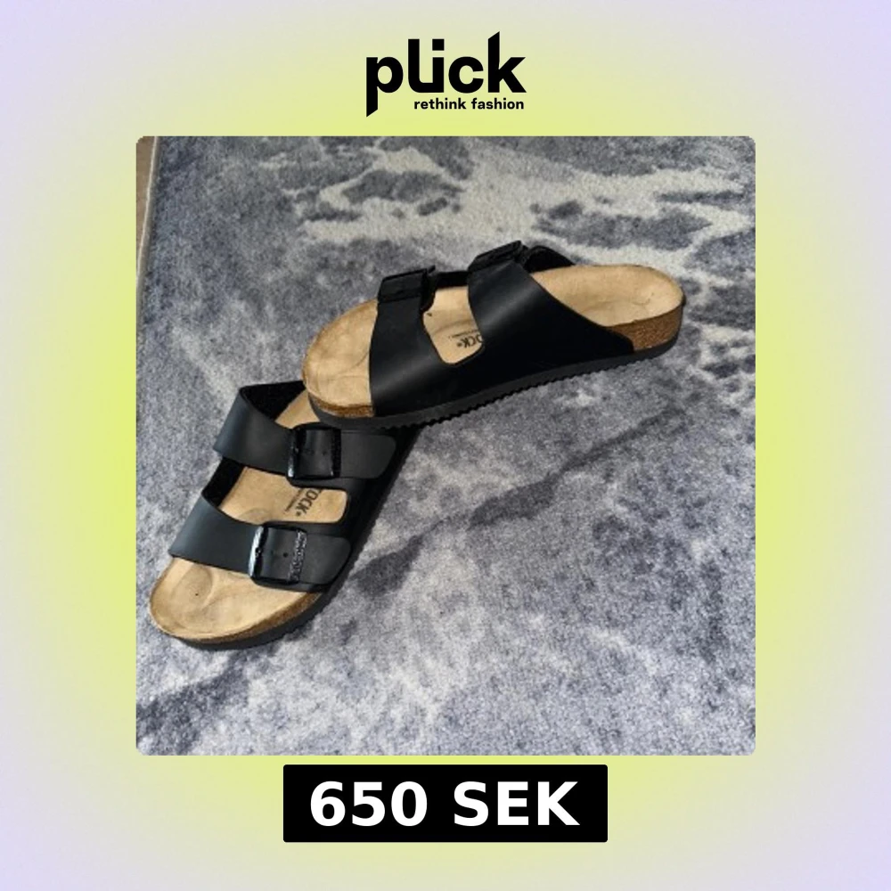 Säljer ett par klassiska svarta sandaler från Birkenstock med två justerbara remmar och en bekväm korksula. Perfekta för sommarens alla äventyr. Sandalerna har en ergonomisk fotbädd för extra komfort.