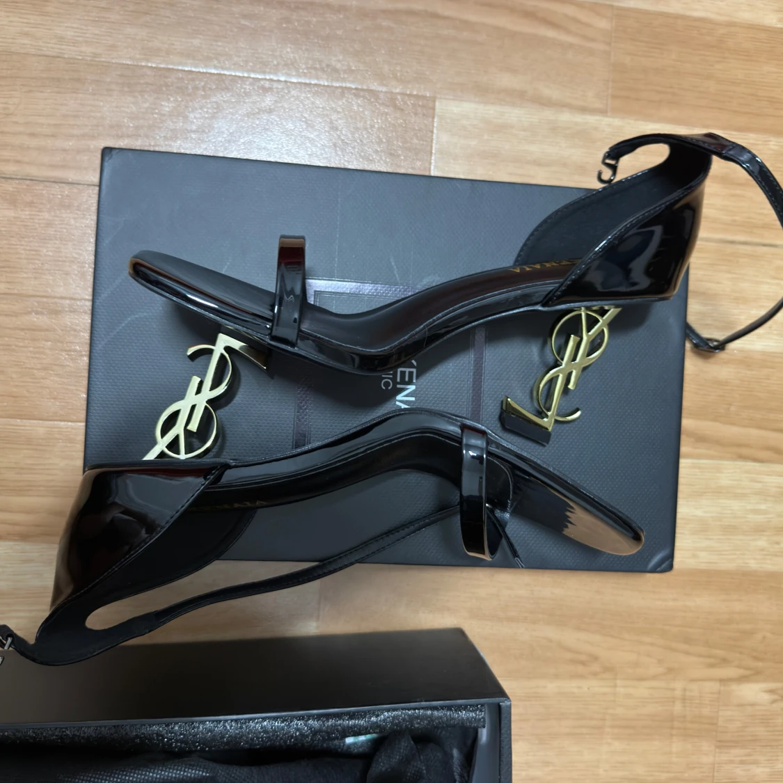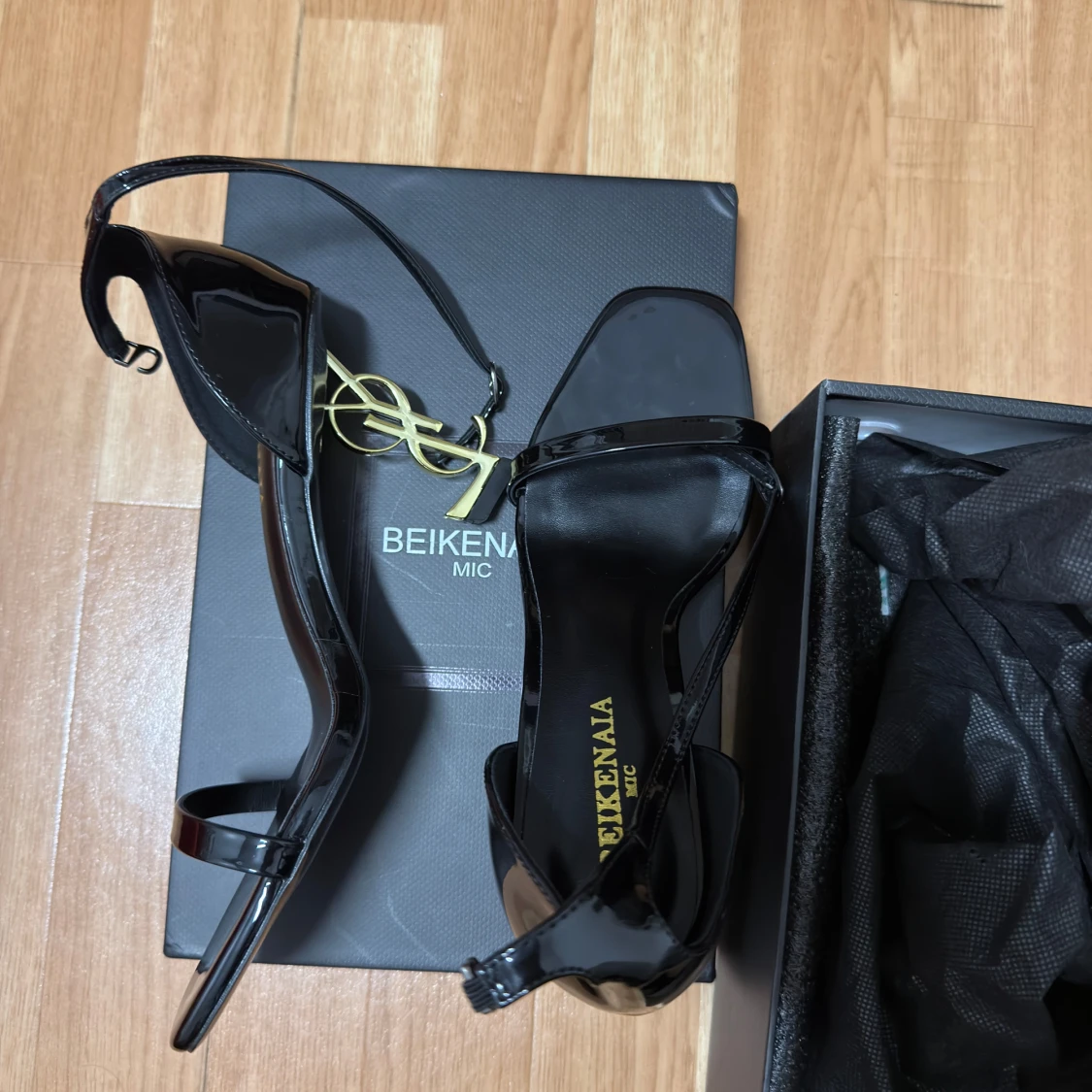 Stilrena svarta sandaler med hög guldklack i metall och öppen tå. Skorna har en smal rem över tårna och runt vristen, samt en fyrkantig tåform. Perfekta för dig som vill sticka ut med en lyxig och modern look.