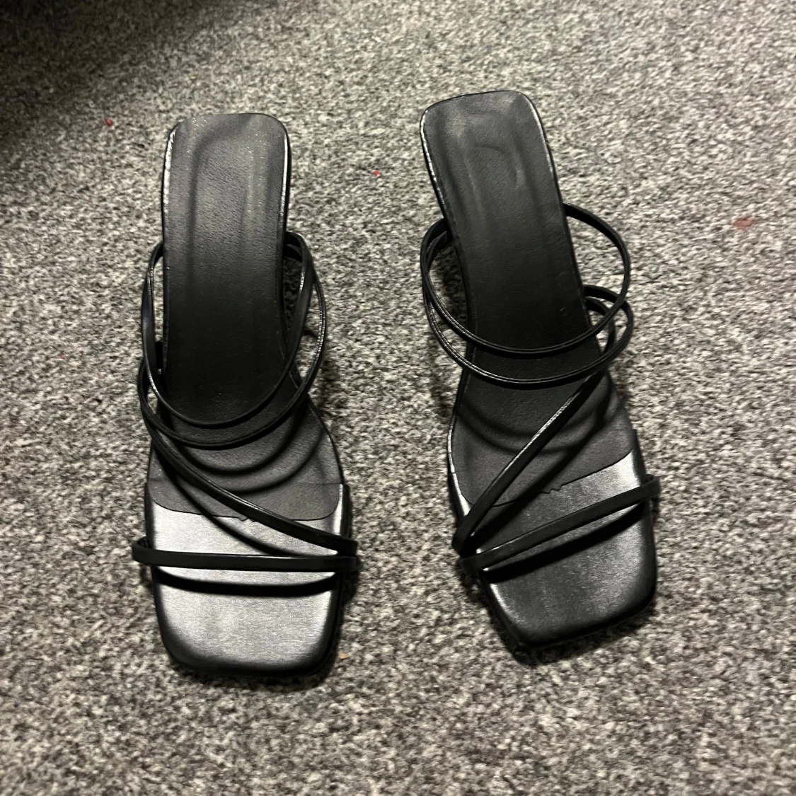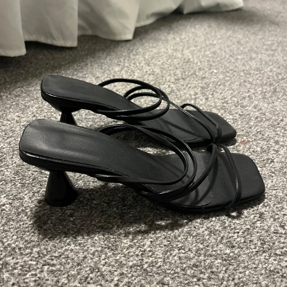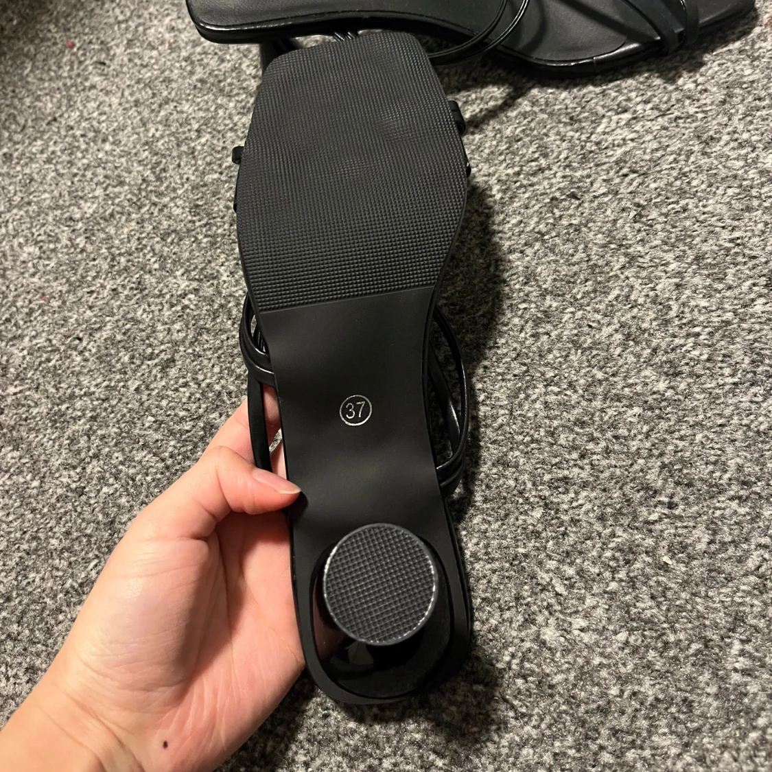 Snygga svarta sandaler med smala remmar och fyrkantig tå. De har en elegant klack och är perfekta för en stilren look. Storlek dam 37.