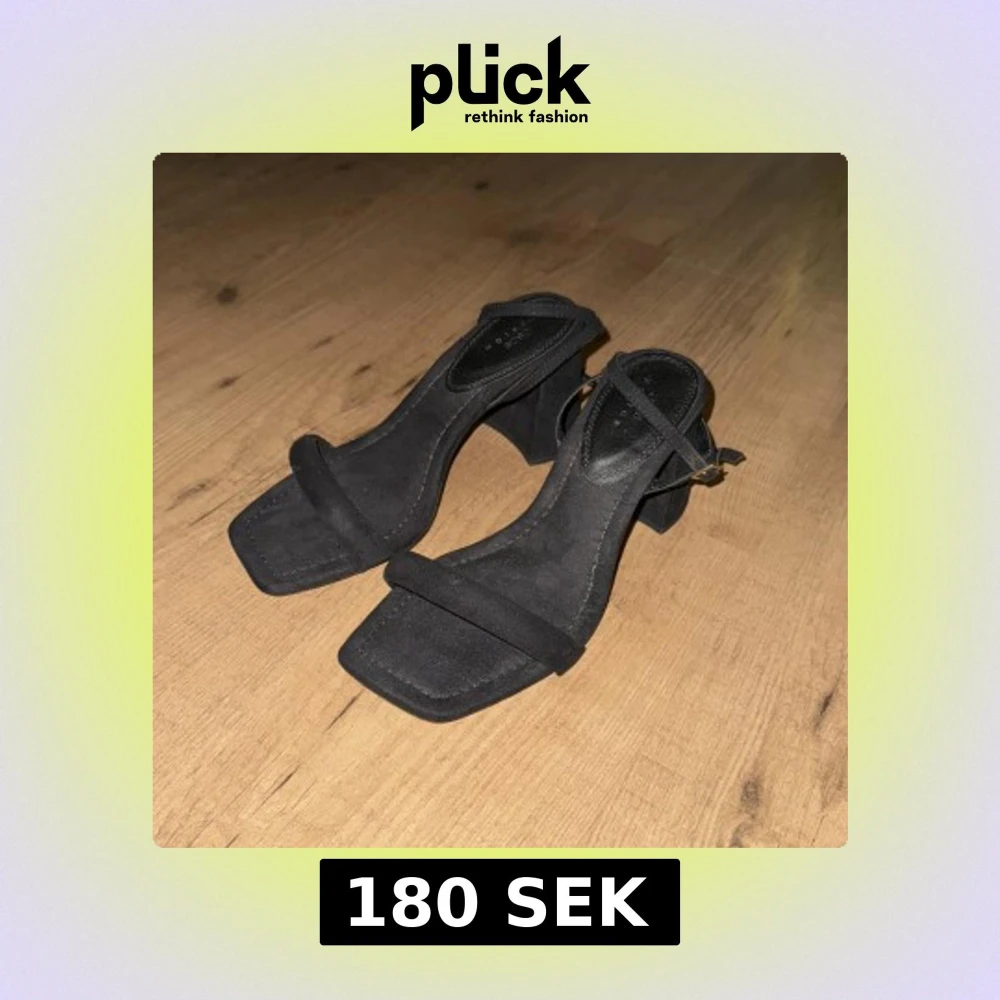 Stilrena svarta sandaler med fyrkantig tå och klack. De har en smal rem över tårna och en justerbar rem runt ankeln. Klacken är 9cm. Passformen är ”wide fit”