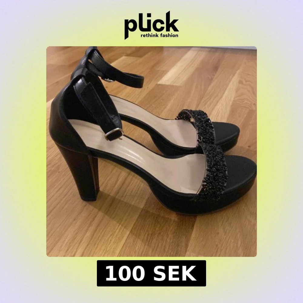 Snygga svarta sandaler med hög klack och öppen tå. Skorna har en glittrig rem över tårna och justerbart spänne runt vristen. Perfekta för en ute kväll.