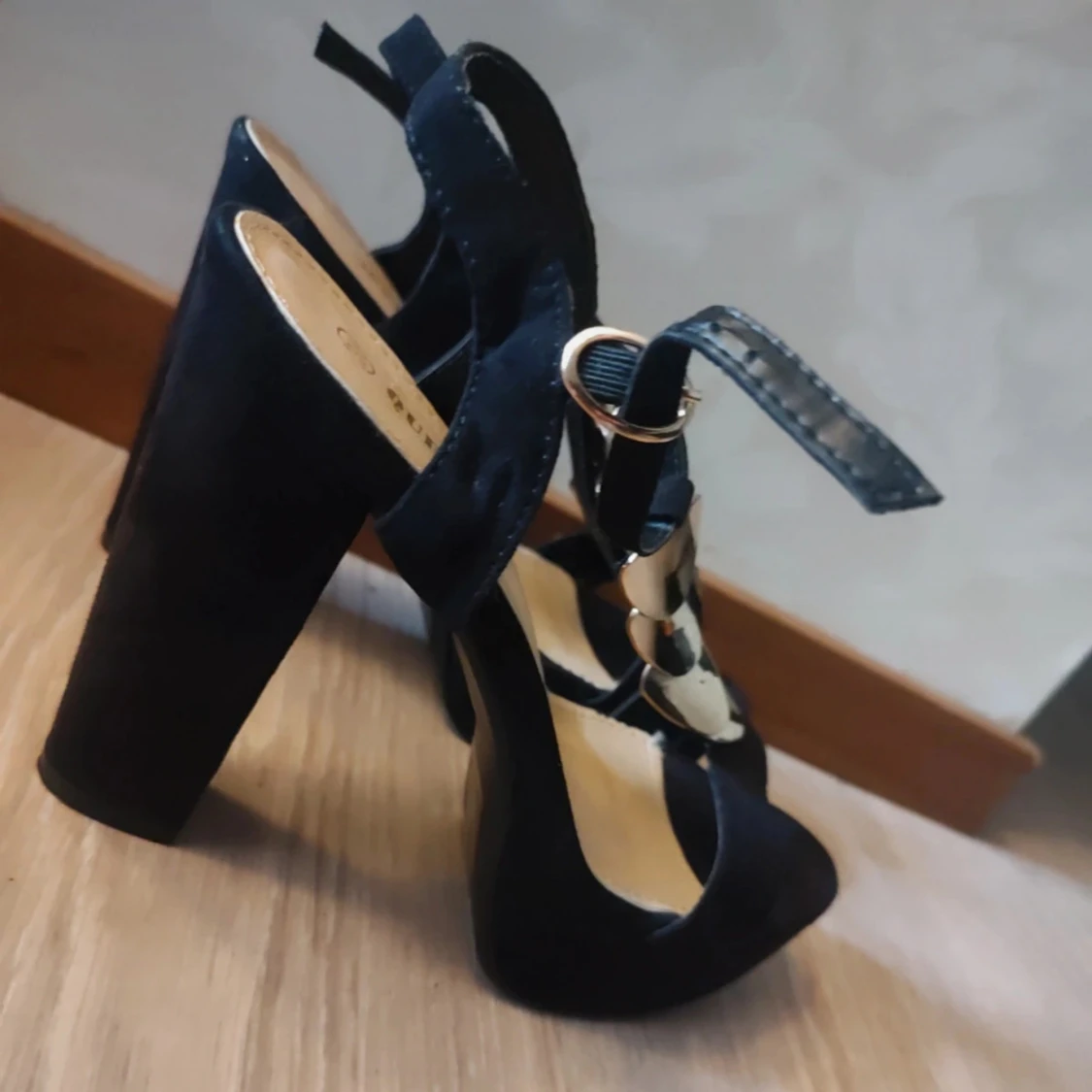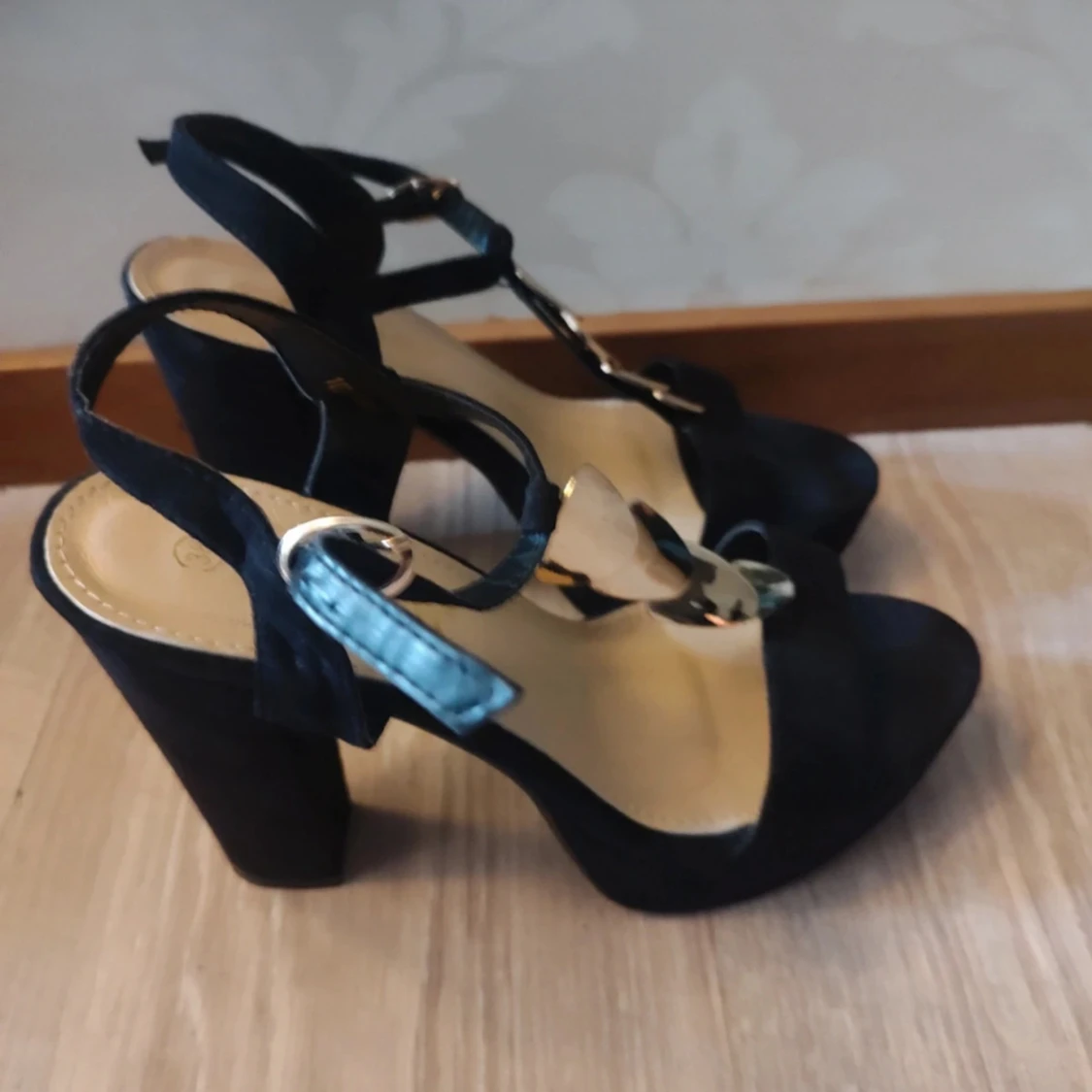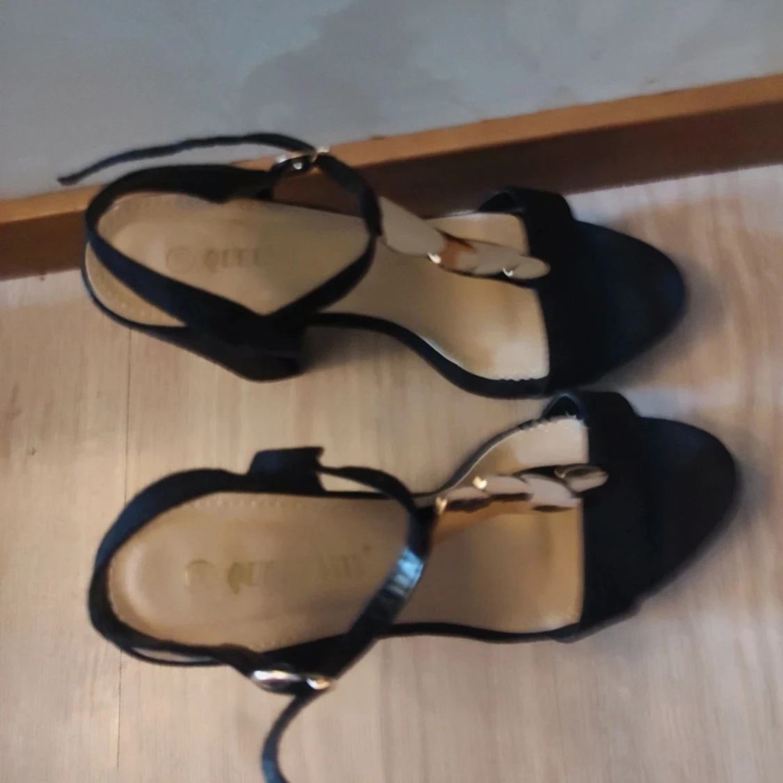 Eleganta svarta sandaler med hög klack och gulddetaljer. Sandalerna har en öppen tå och justerbara remmar för perfekt passform. Perfekta för en stilfull look.