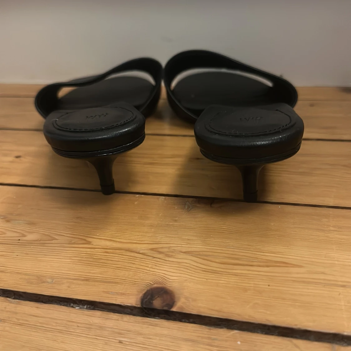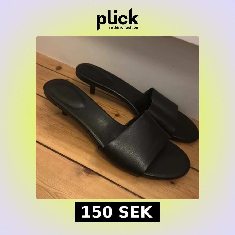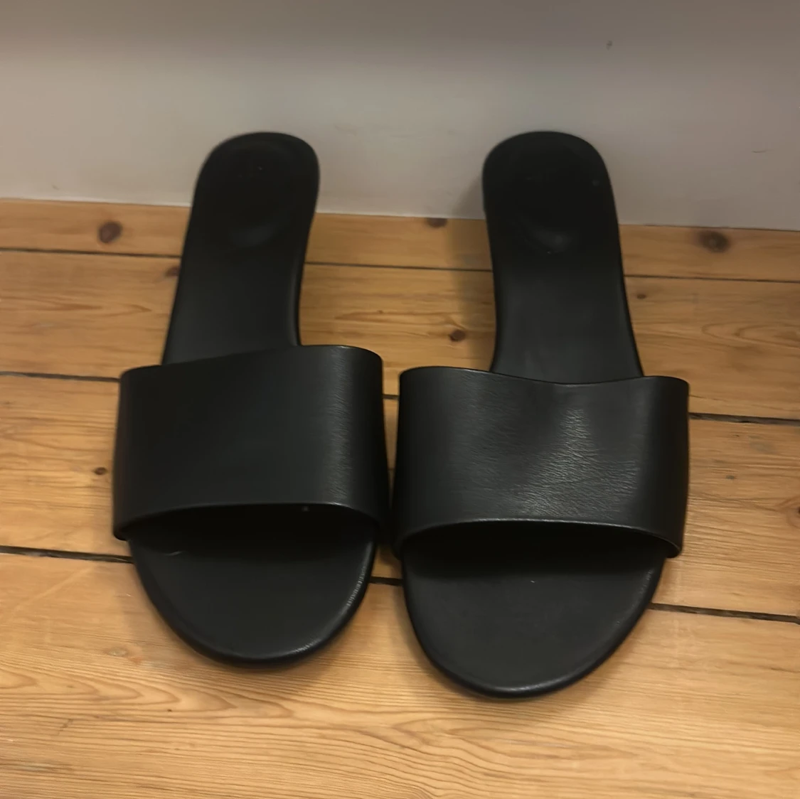 Stilrena svarta sandaler från H&M med öppen tå och låg klack. Skorna har en bred rem över foten och är tillverkade i syntetmaterial med en platt sula framtill. Perfekta för en trendig och minimalistisk look.