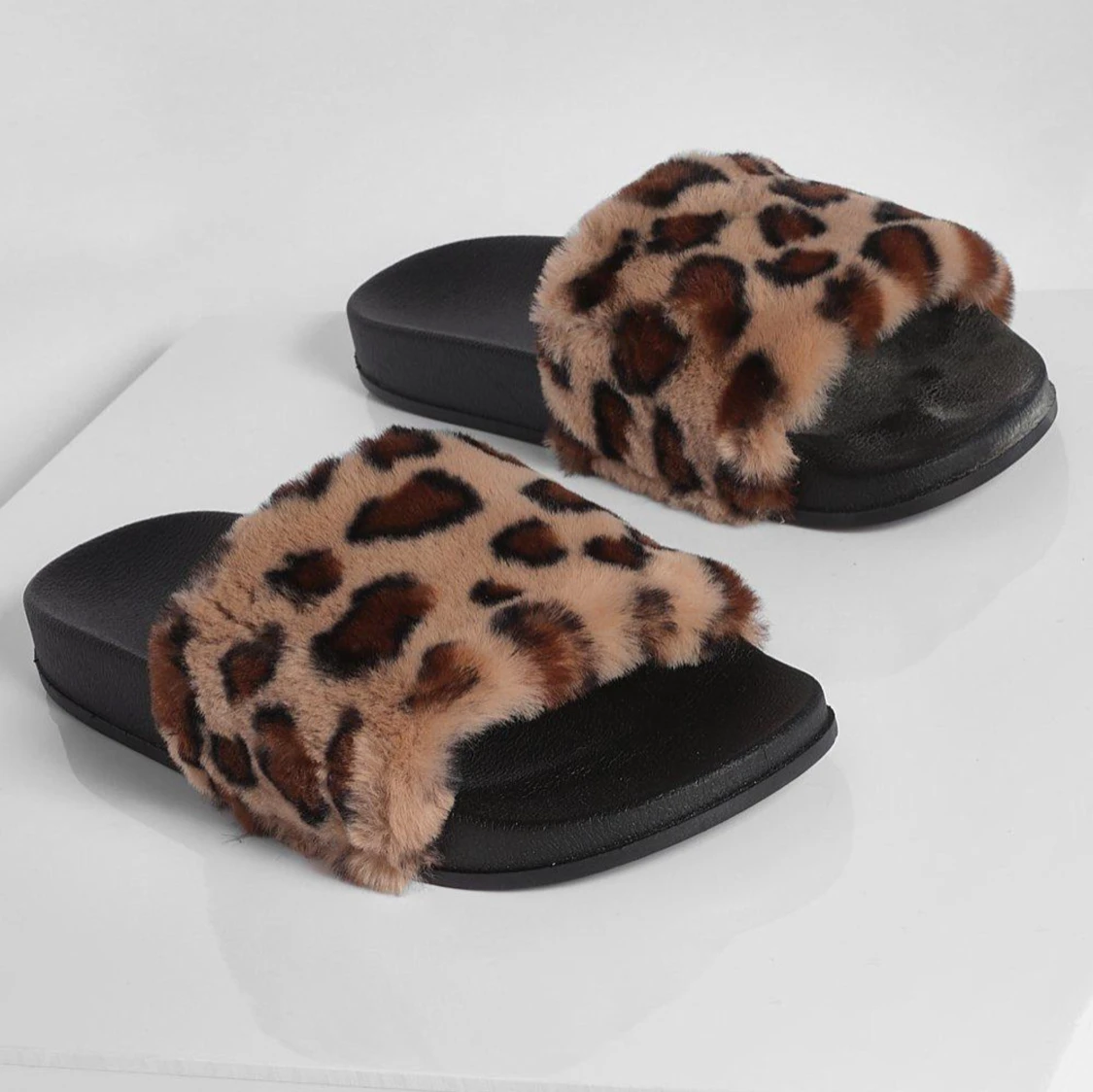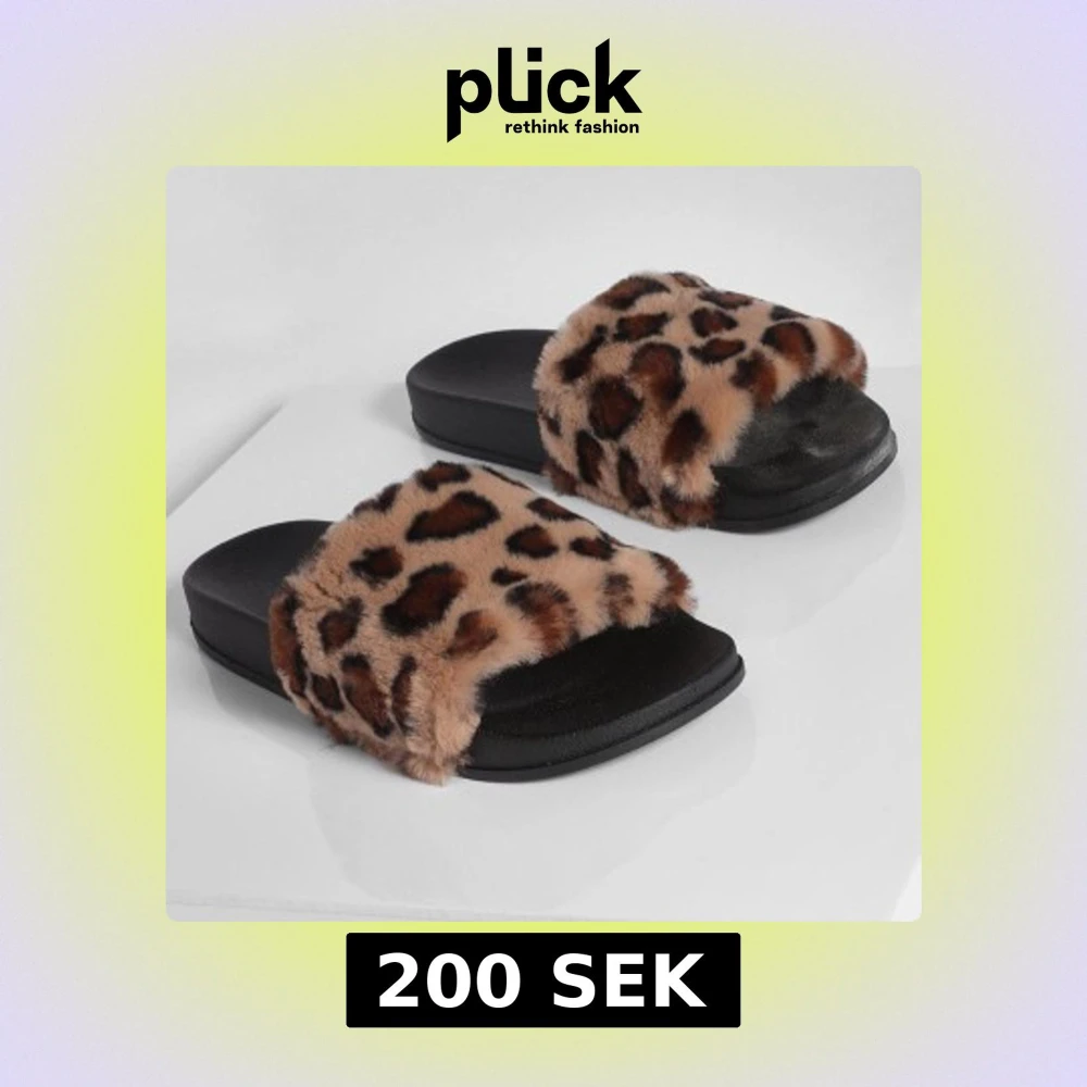 Snygga svarta sandaler med en mjuk och fluffig rem i leopardmönstrad päls. Perfekta för en avslappnad stil med en touch av djurmönster.