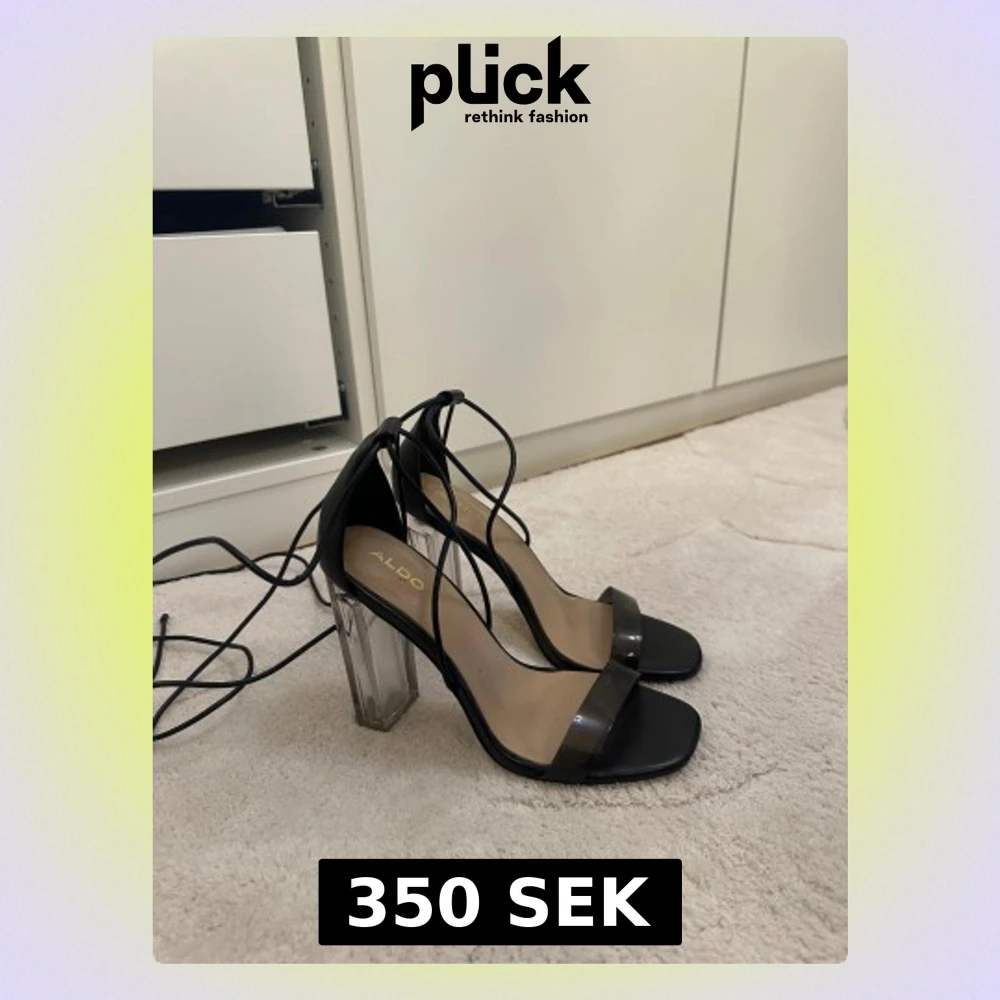 Snygga svarta sandaler från Aldo med transparent blockklack och tunna snörningar som går runt ankeln. Skorna har öppen tå och en bred rem i plast över foten. Perfekt för dig som gillar trendiga detaljer och vill sticka ut med en cool klack.