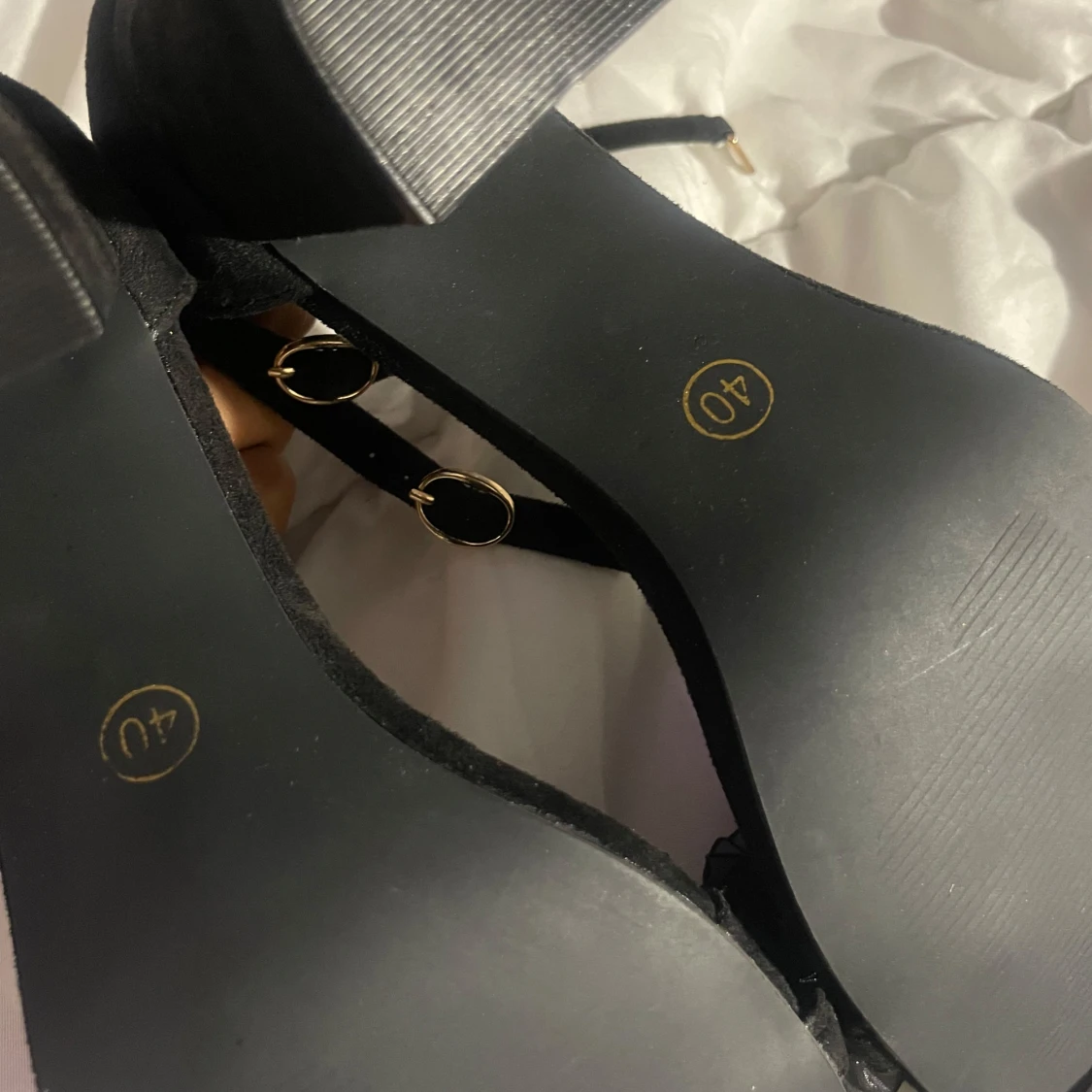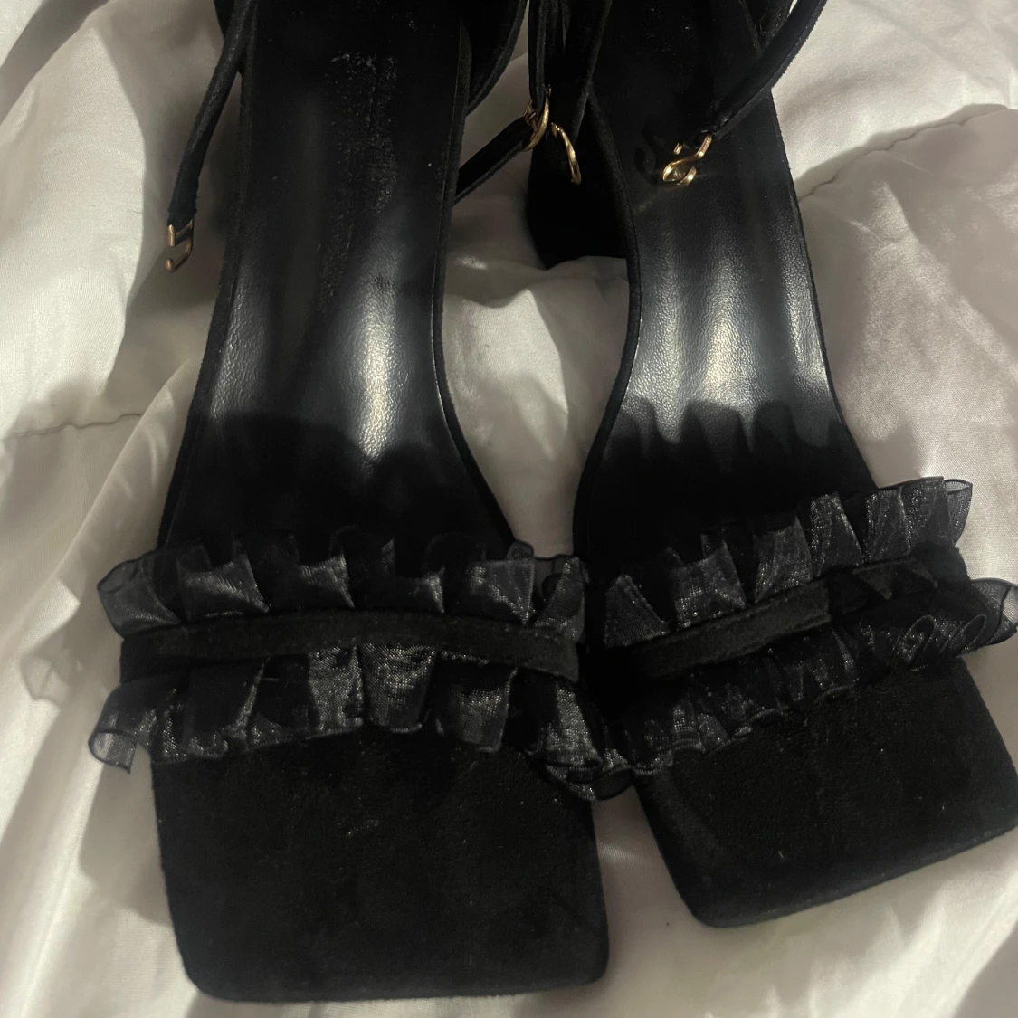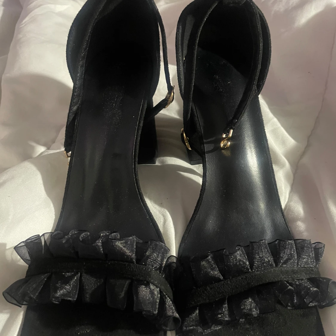 Svarta sandaler med fyrkantig tå, klack och justerbar rem runt vristen. Framtill finns en snygg volangdetalj i organza som ger en extra touch. Skorna har guldfärgade spännen och är tillverkade i mockaliknande material. Perfekta för dig som gillar stilrena men ändå unika skor.