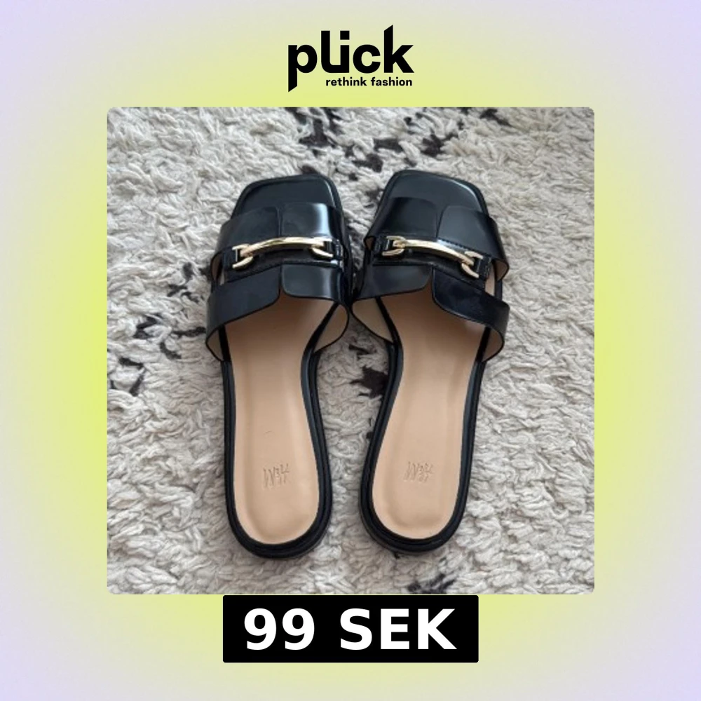 Svarta sandaler/slip-ins från HM med fyrkantig tå och guldfärgad metall-detalj över foten. Platt sula och breda remmar i glansigt syntetmaterial. Använda vid ett (1) tillfälle.