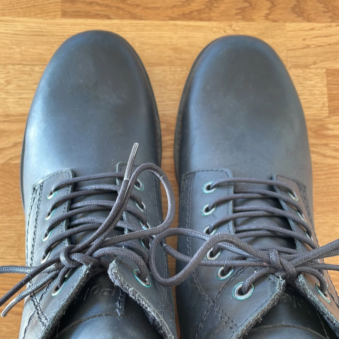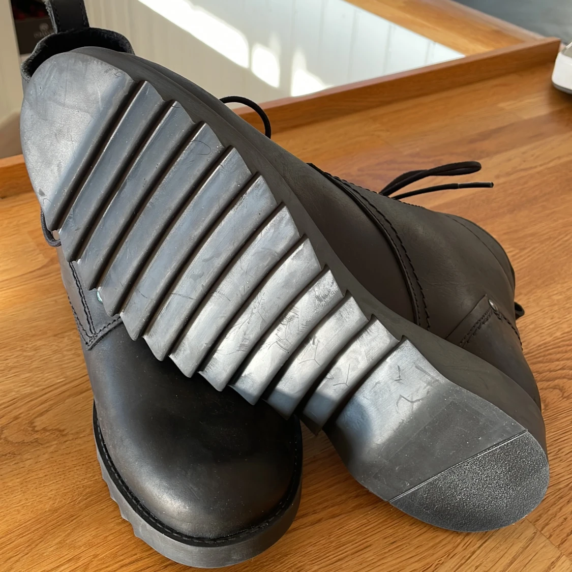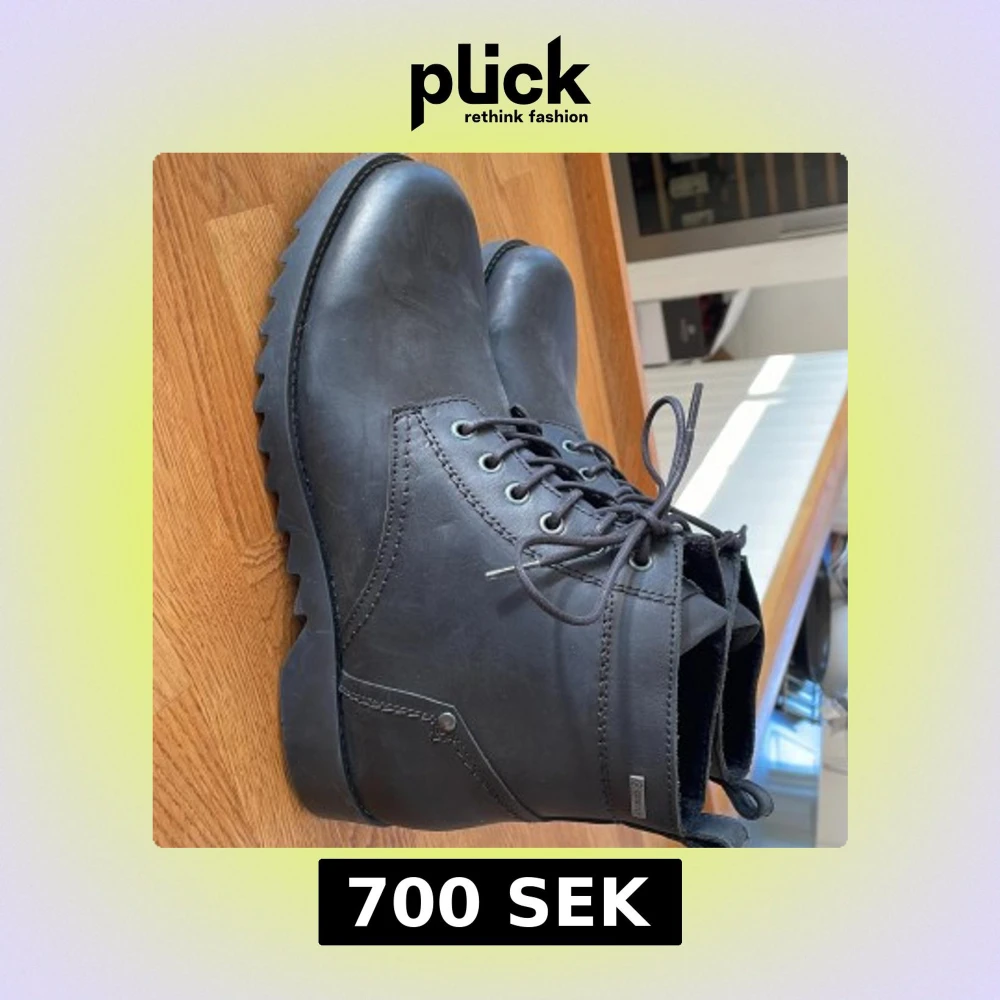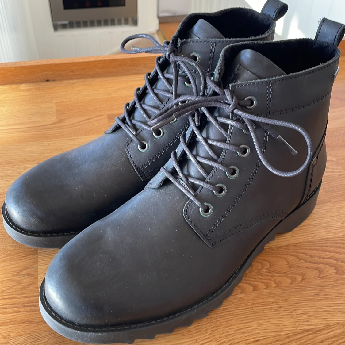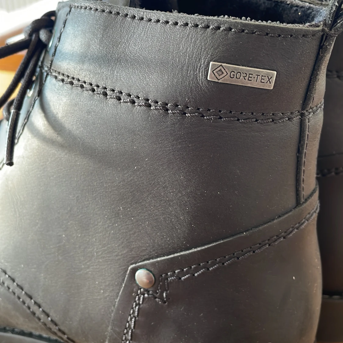 Säljer ett par svarta skinnkängor med snörning och Gore-Tex-material. Perfekta för alla väder med en robust sula och stilren design. Kängorna har en diskret logga och är tillverkade i Portugal, i mjukt skinn. Nypris 1900:-
