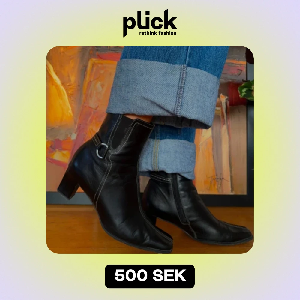 Snygga svarta stövletter i skinn med en stilren design. De har en spetsig tå och en diskret klack som ger lite extra höjd. Stövletterna har dekorativa sömmar och en liten ringdetalj på sidan. Perfekta för både vardag och fest!