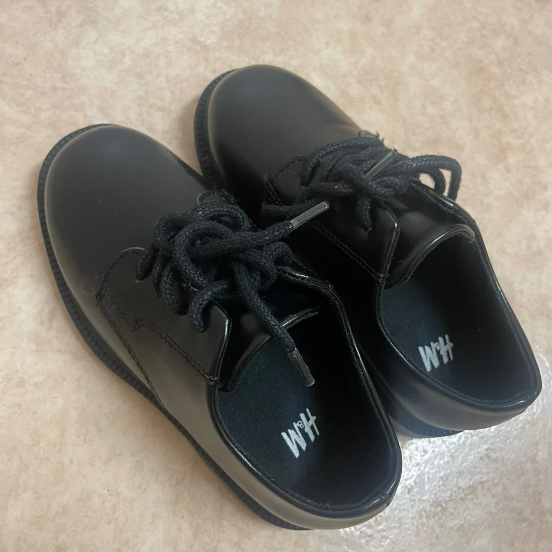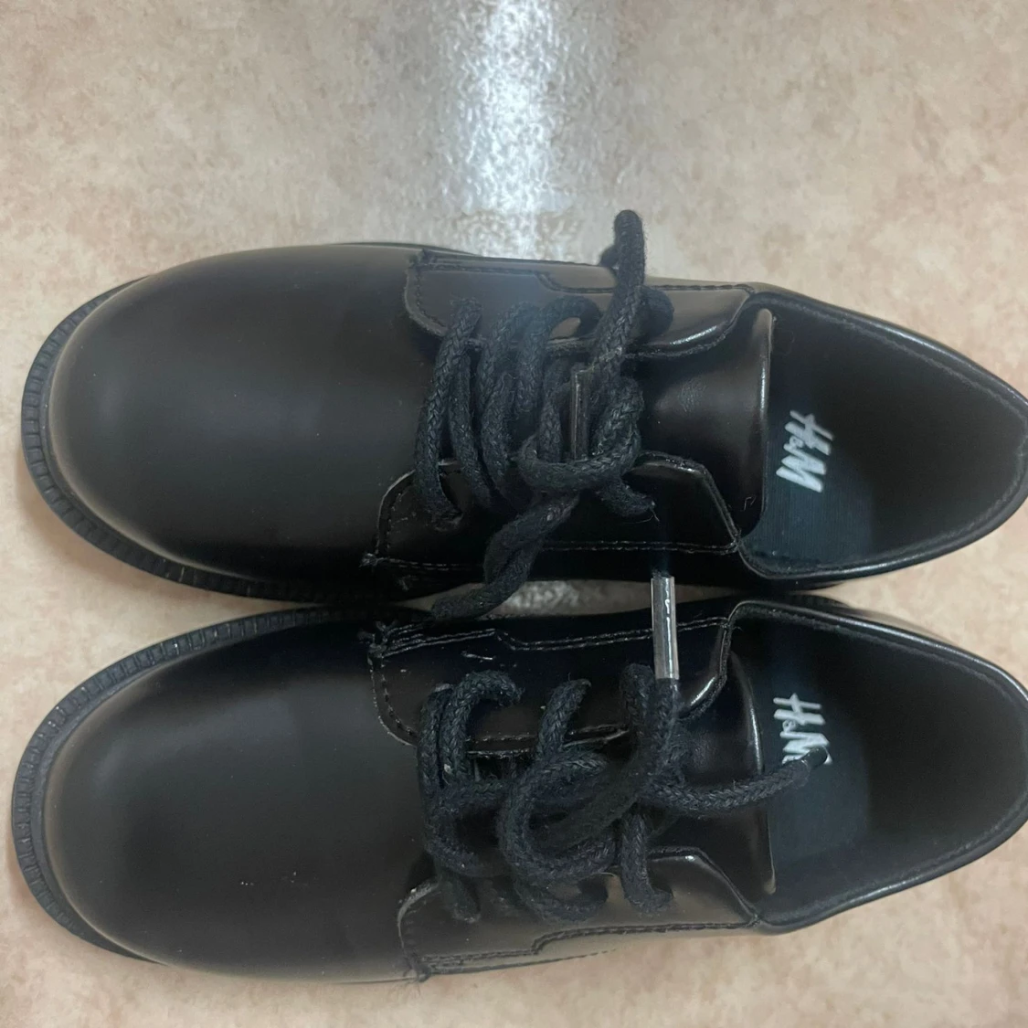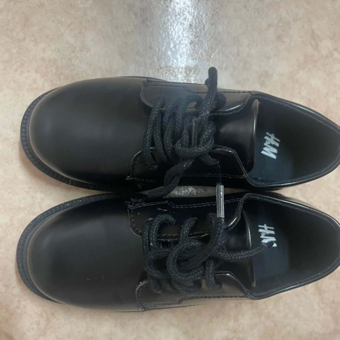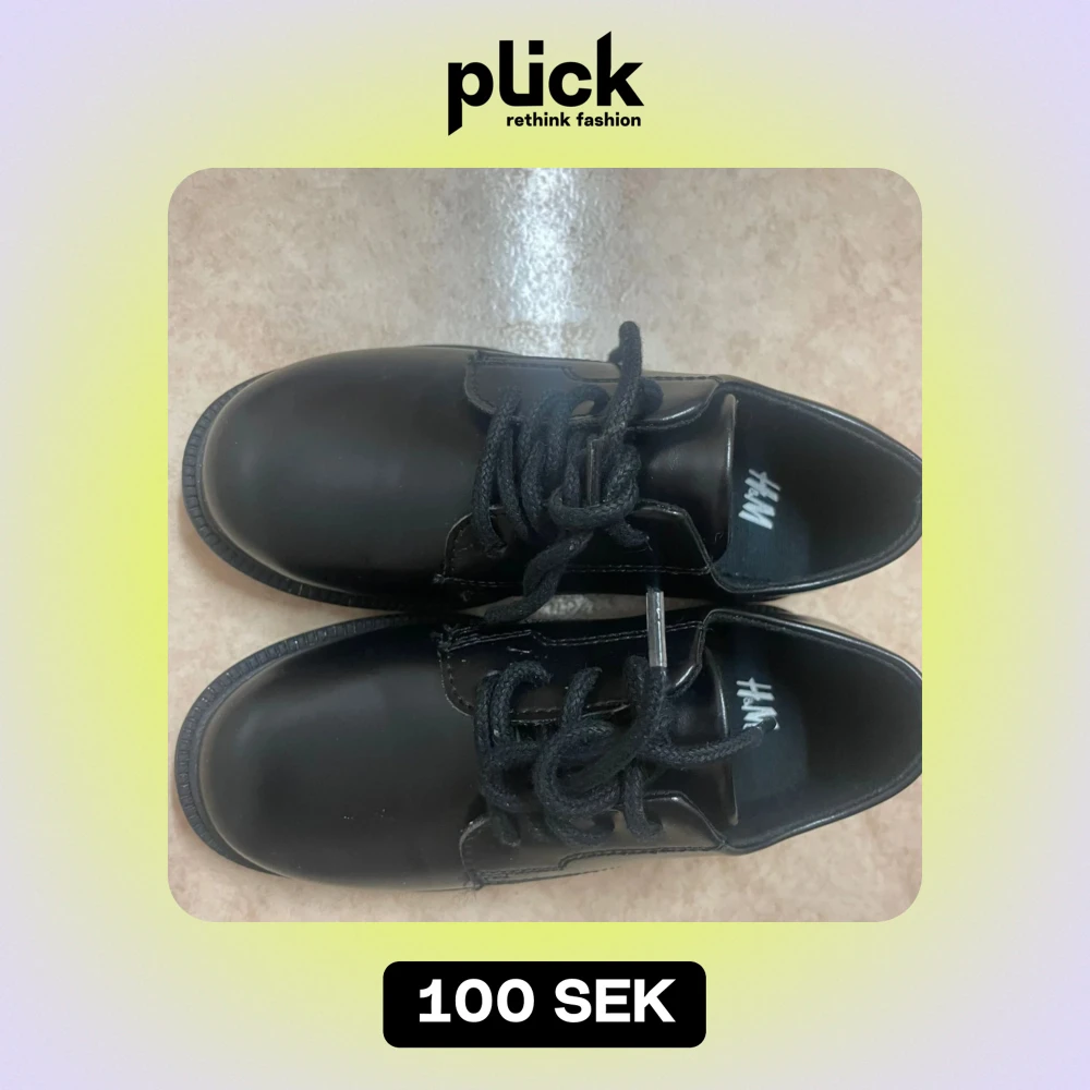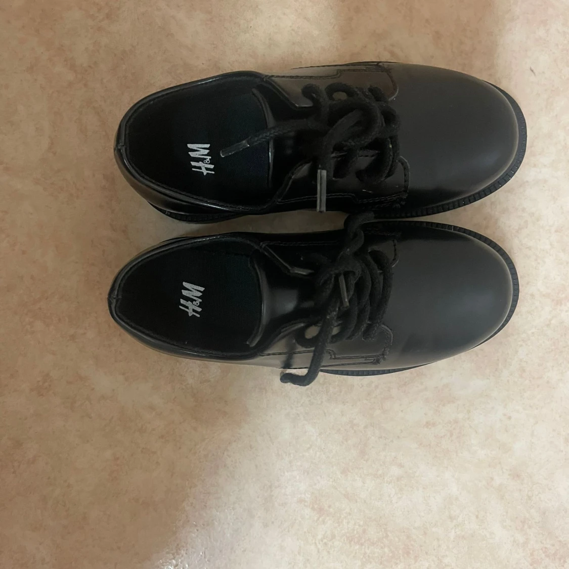 Snygga svarta skor från H&M i syntetmaterial. De har en klassisk design med snörning och en rund tå. Perfekta för både vardag och festliga tillfällen. Skorna är i mycket bra skick och redo att användas direkt.
