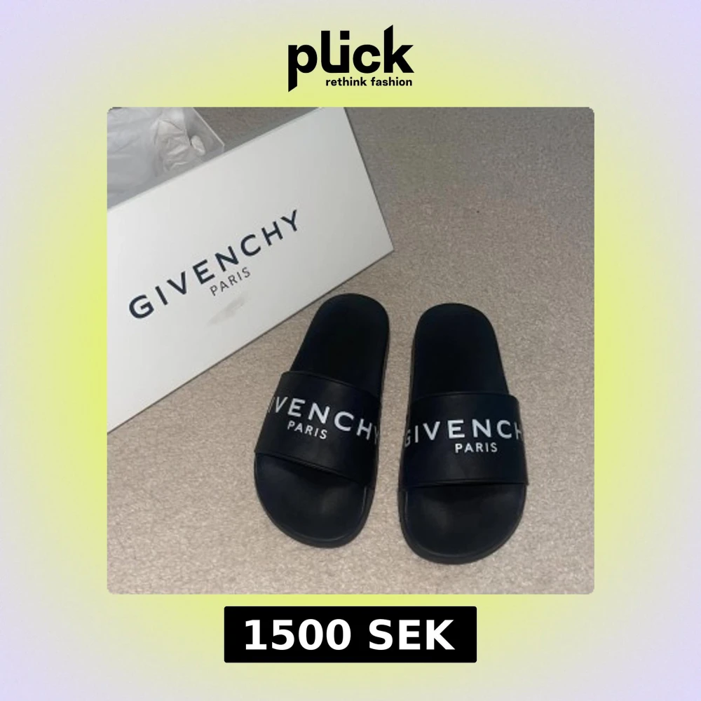 Svarta slides från Givenchy Paris med vit logga över foten. Snygg och clean design med platt sula och öppen tå. Tillverkade i syntetmaterial, perfekta för sommaren eller chill dagar. Kommer med originalkartong.