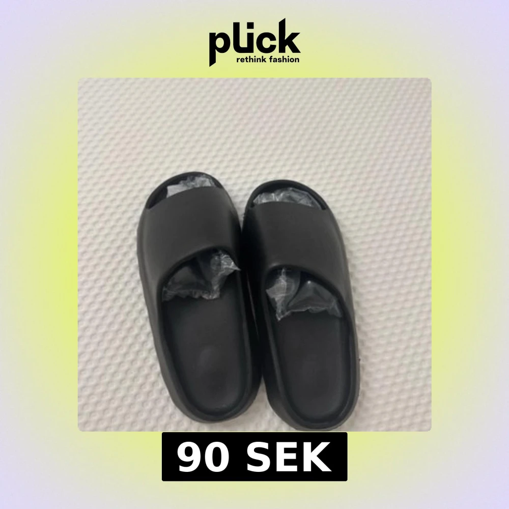 Svarta slides med öppen tå och platt sula. Tillverkade i syntetmaterial med enkel och stilren design. Perfekta för sommaren eller att ha hemma. Säljs utan synligt märke.