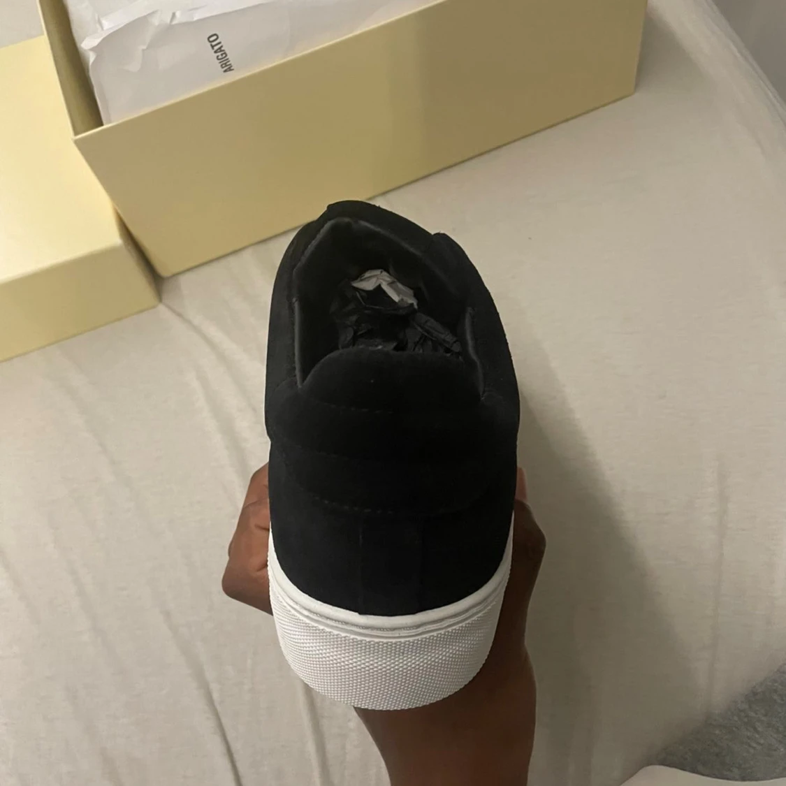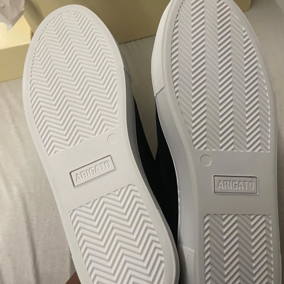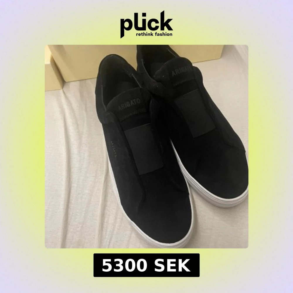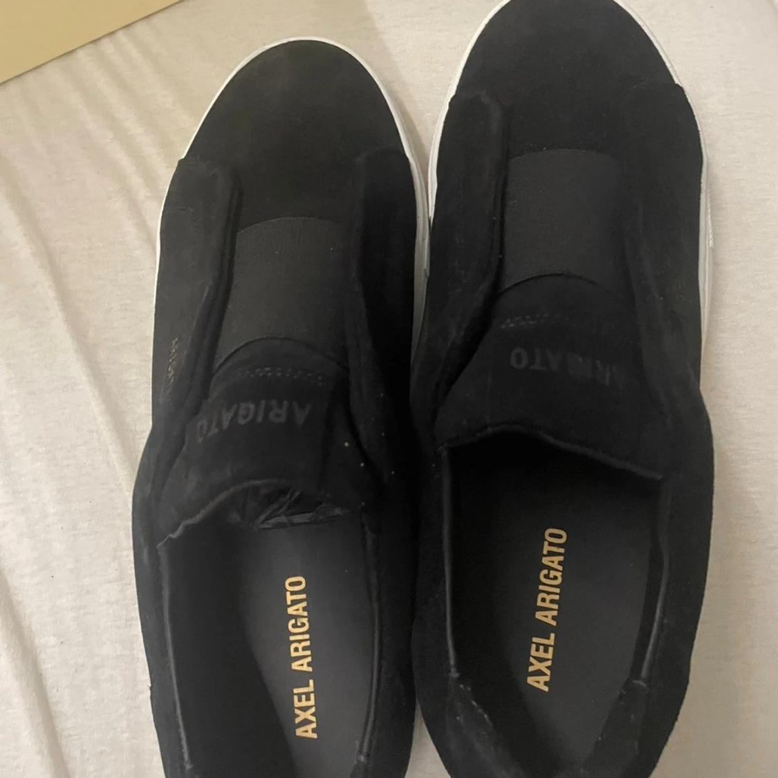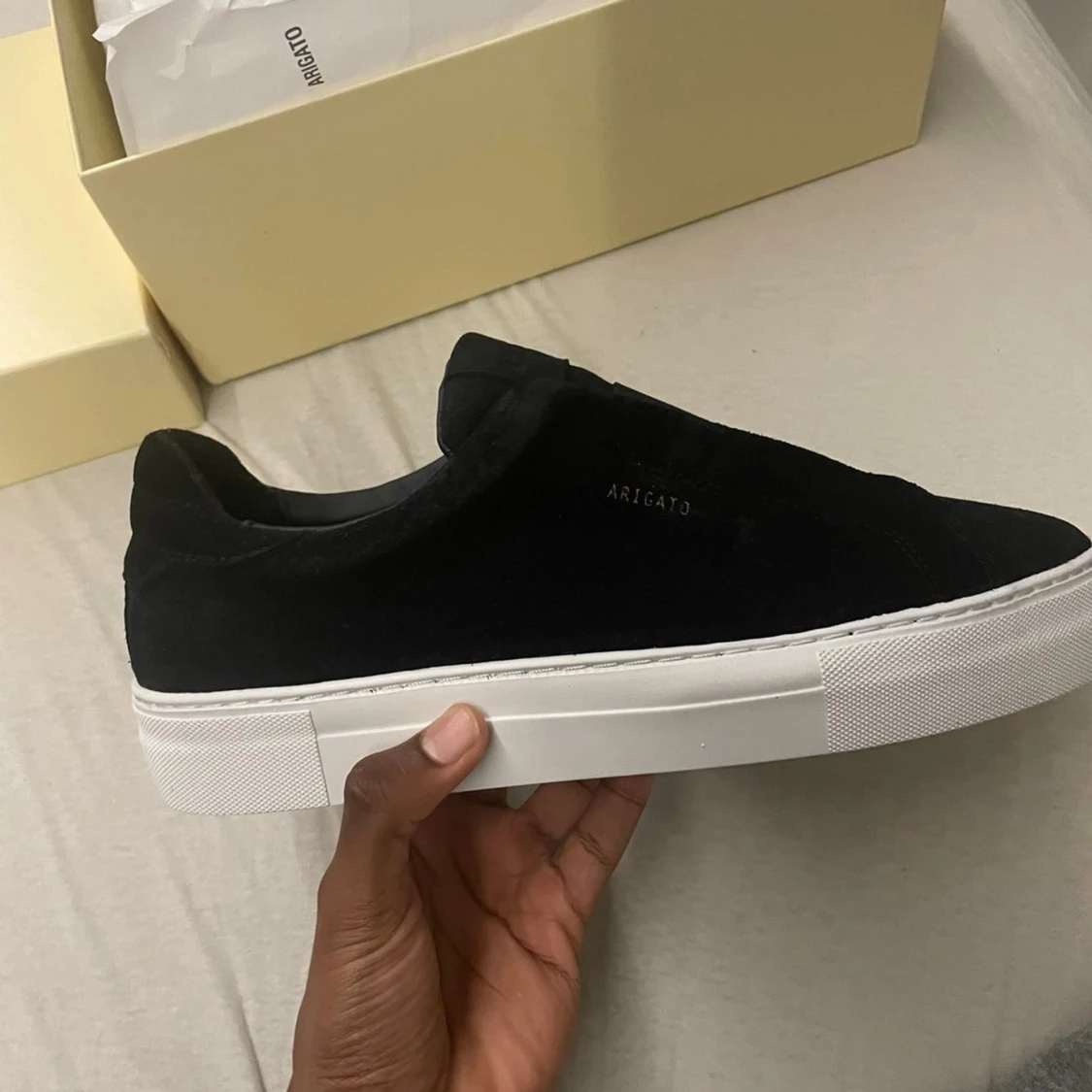 Gamla 360 laceless modellen som inte säljs mer. Stilrena svarta sneakers från Axel Arigato i mjuk mocka med vit platt sula. Skorna har minimalistisk design utan snörning, elastiskt band över vristen och diskret logga i guld på sidan. Perfekta för dig som gillar clean och modern look.