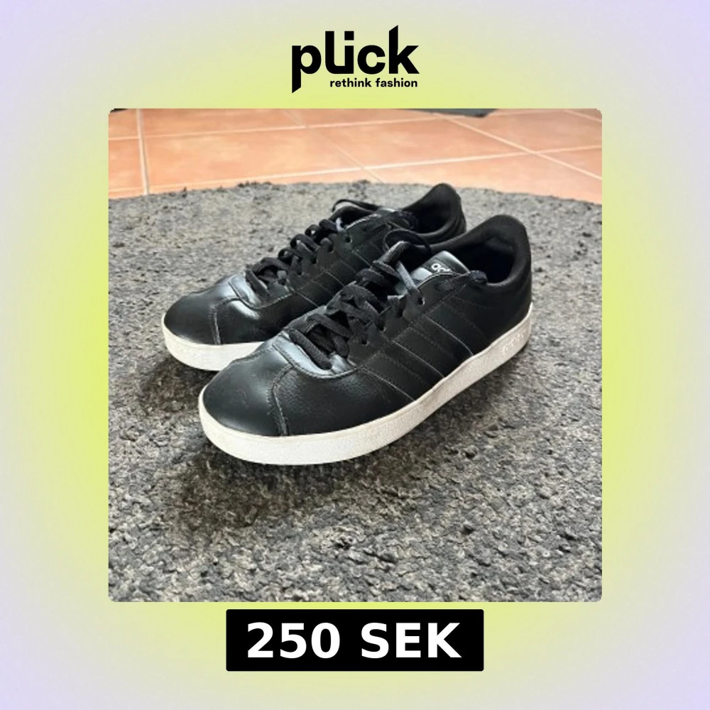 Snygga svarta sneakers från Adidas med vit sula och klassisk design. Skorna har snörning och är perfekta för en avslappnad stil. De har en rund tå och är tillverkade i skinnimitation.