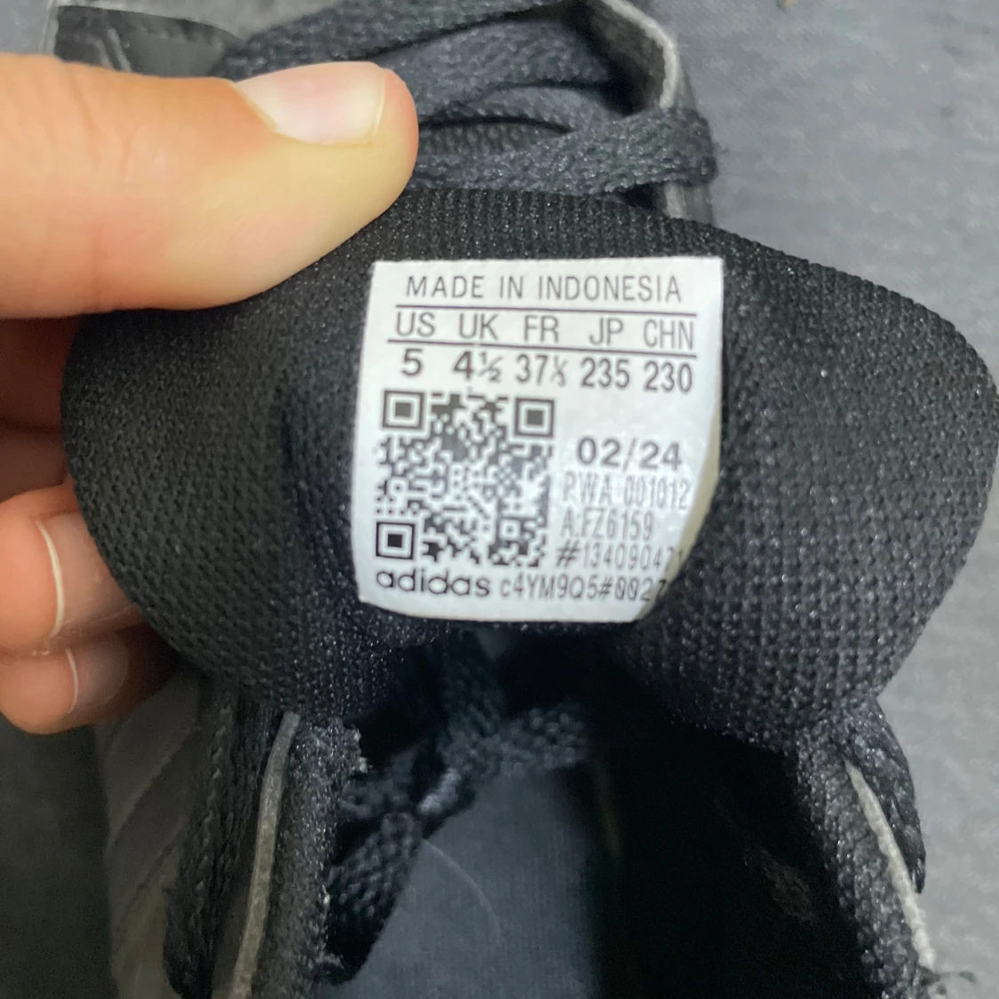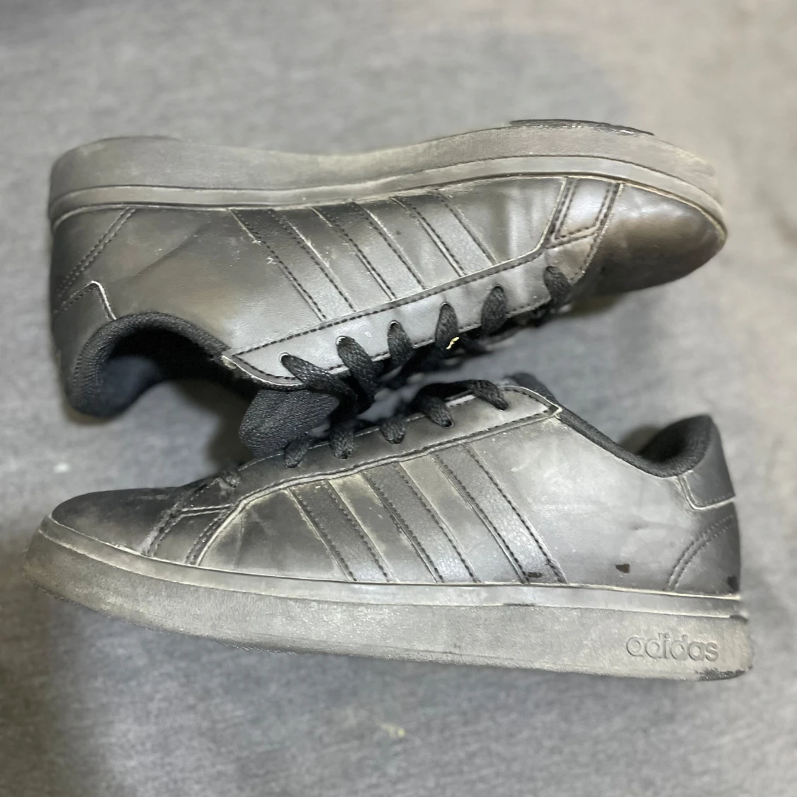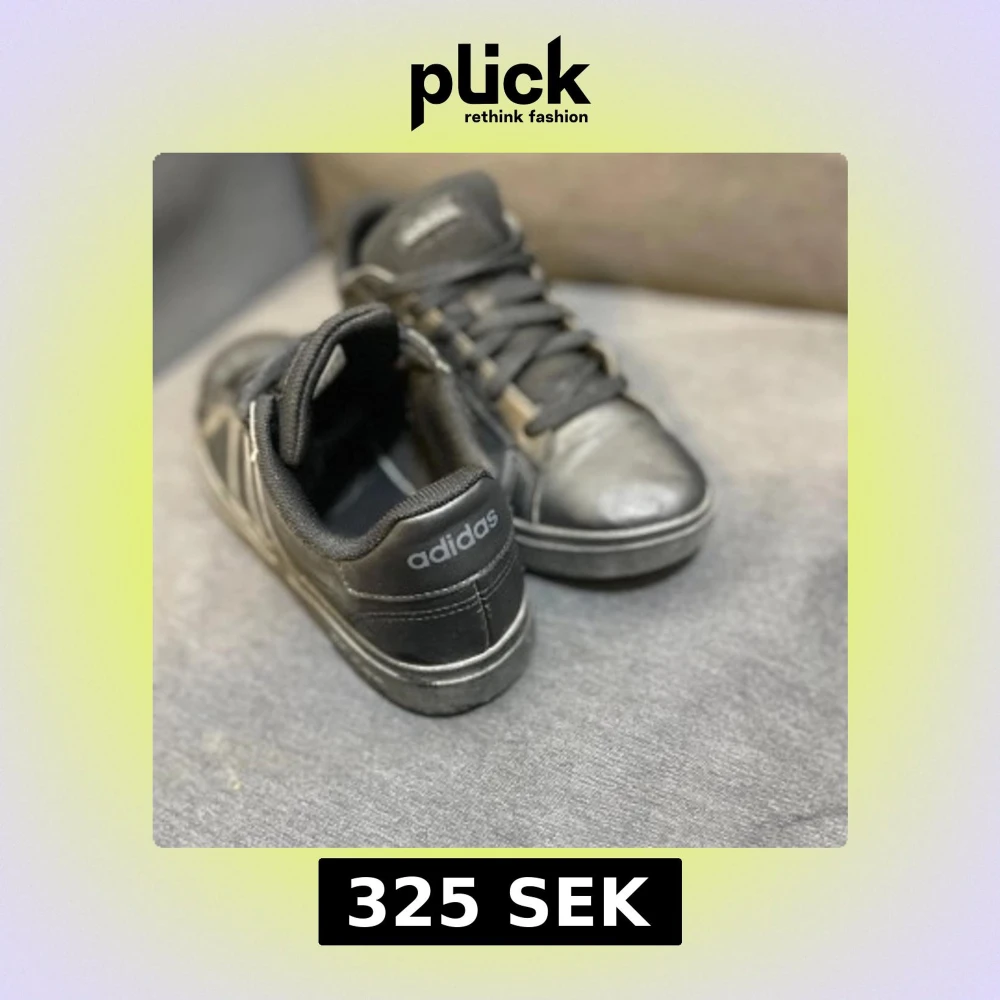 Säljer ett par svarta Adidas sneakers i storlek 37 med klassiska tre ränder på sidan och Adidas-logga på hälen. Skorna har snörning, platt sula och är tillverkade i skinn med textilfoder. Perfekt för dig som gillar stilrena och sportiga skor.