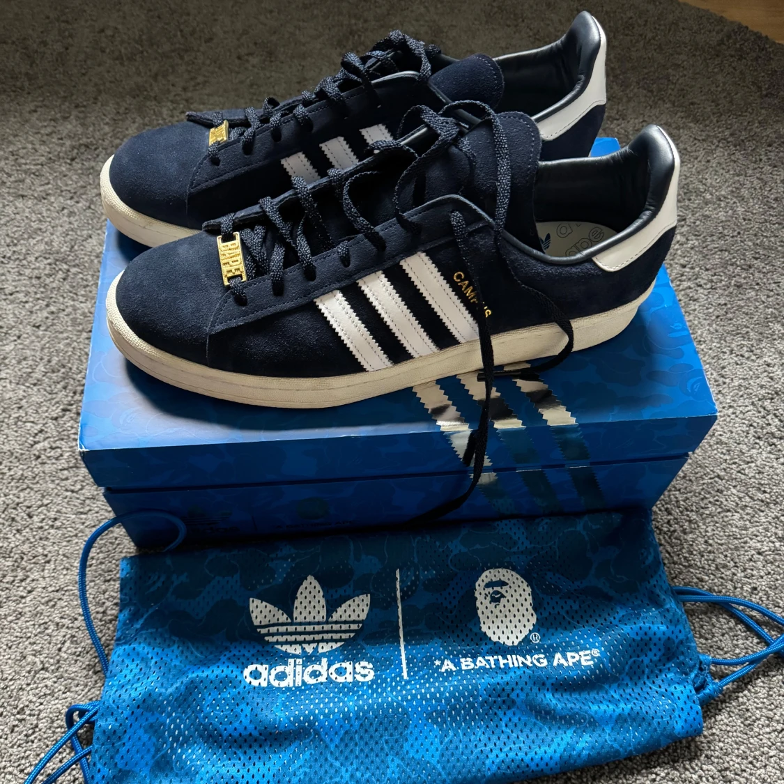Mörkblåa sneakers från samarbetet mellan Adidas och A Bathing Ape. Skorna har vita stripes och en stjärndetalj på sidan. Allt original tillkommer. Använda endast ett fåtal gånger.