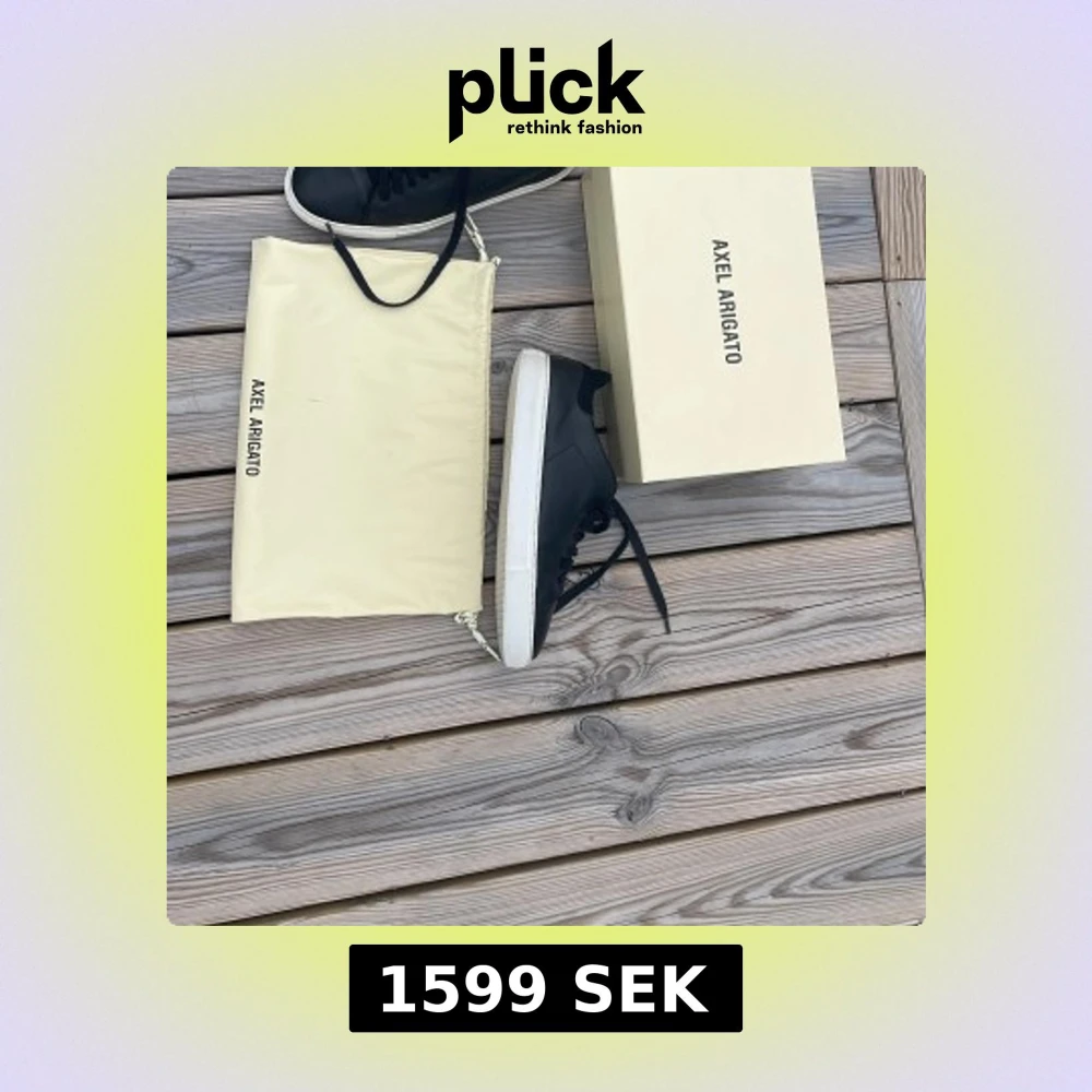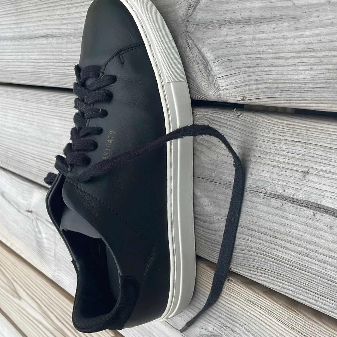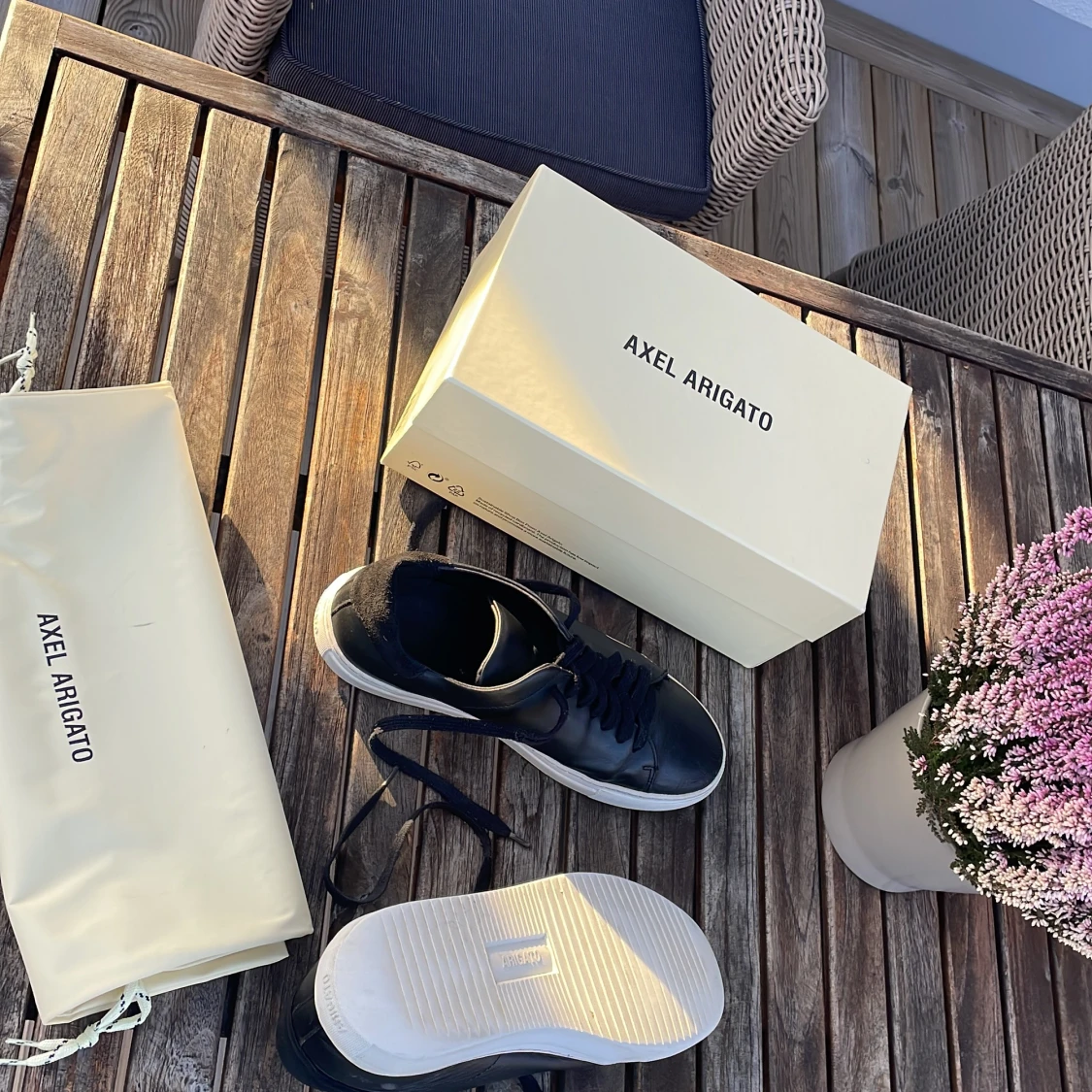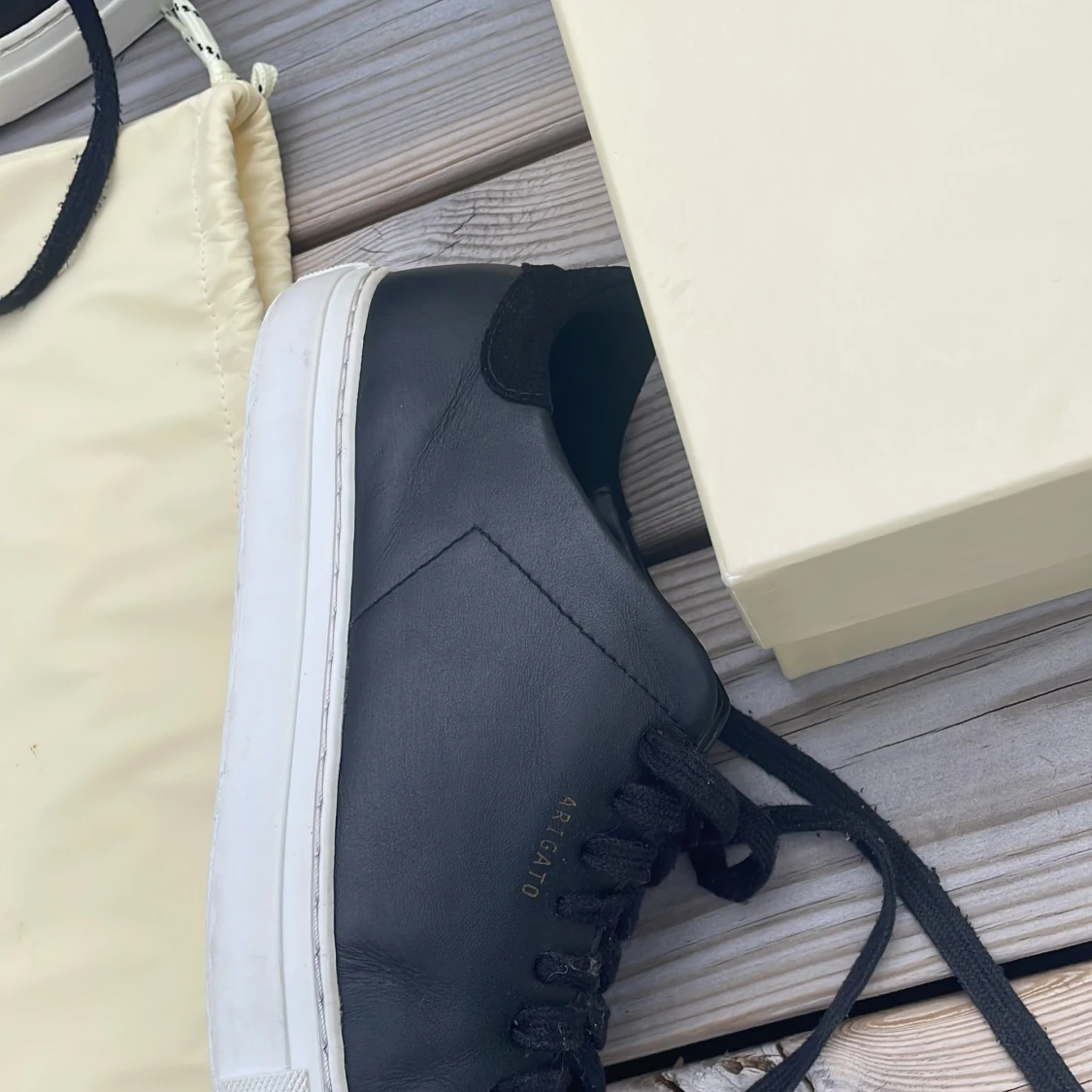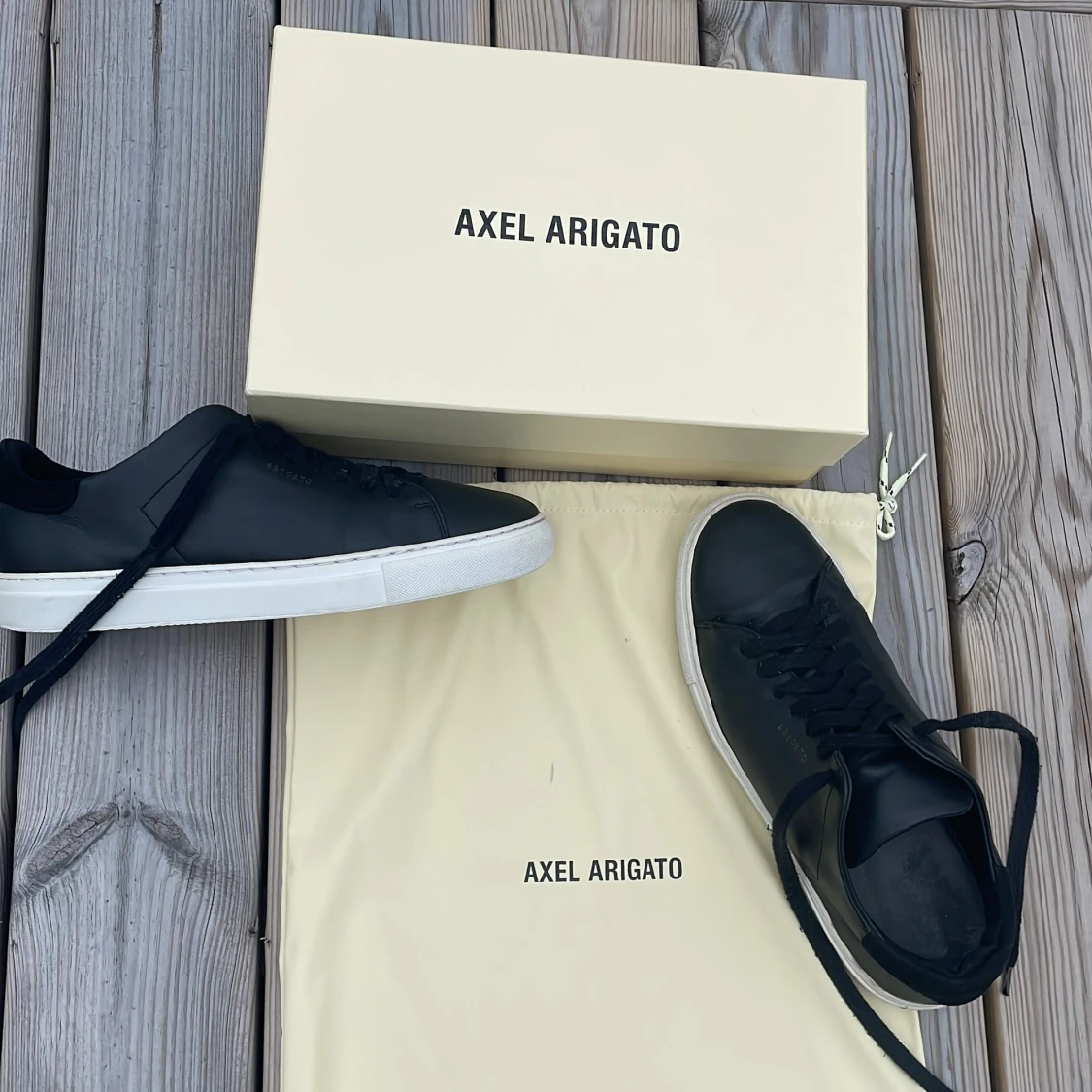 Snygga svarta sneakers från Axel Arigato i skinn med vit platt sula och diskret guldfärgad logga på sidan. Klassisk låg modell med svarta snören och minimalistisk design. Skorna levereras med originalpåse och låda. Priset är inte hugget i sten och kan gå ner i sanbbaffär. Använda sparsamt i cirka en till två mån och kvitto finns köpta för cirka 2500. Killar