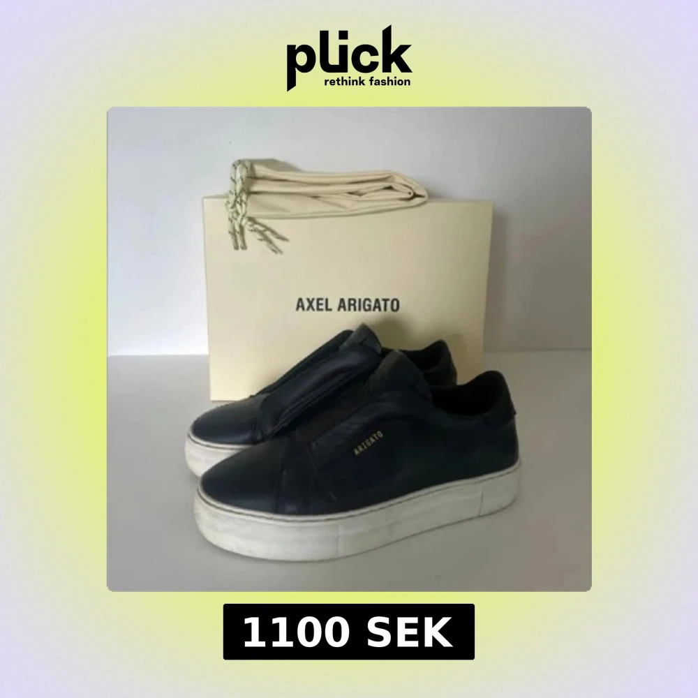 Snygga svarta sneakers från Axel Arigato i skinn med vit platt sula och minimalistisk design. Skorna har en stilren look utan snörning och diskret guldfärgad logga på sidan. Perfekta för dig som gillar clean och modern stil.