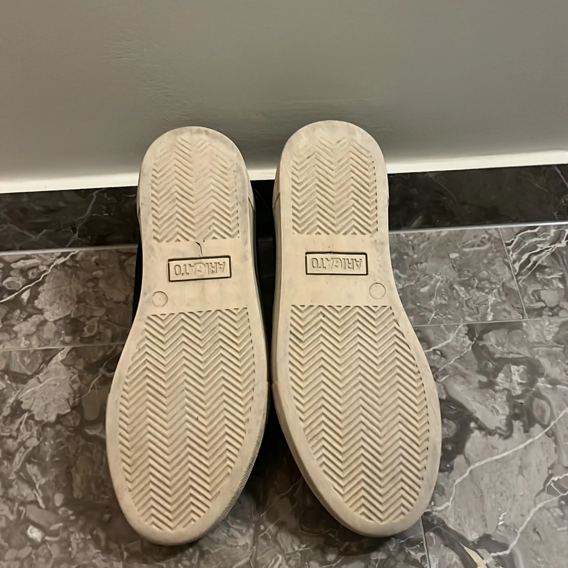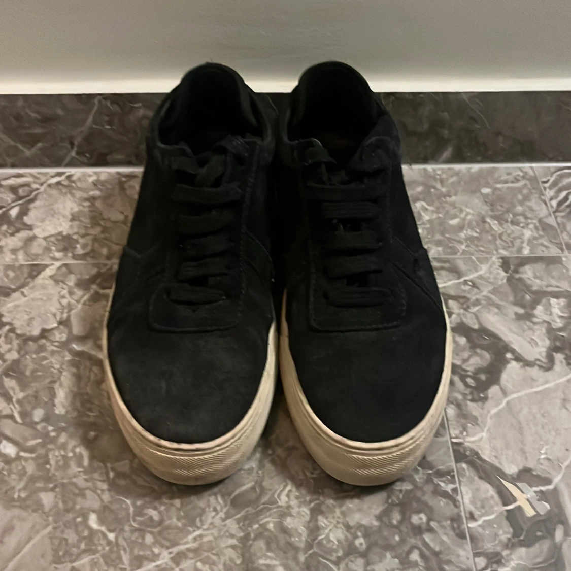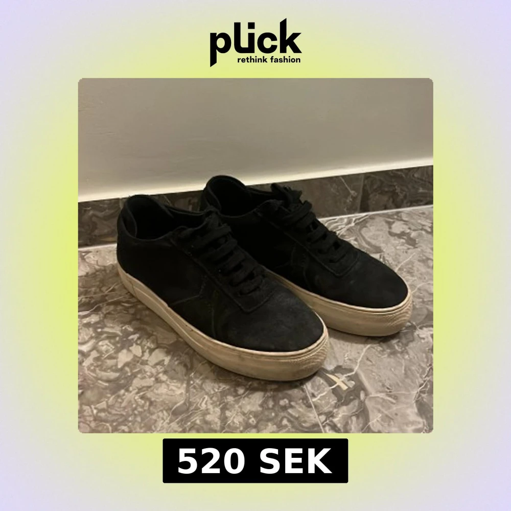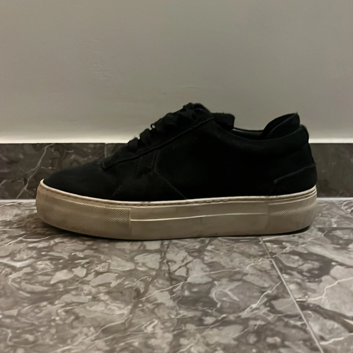 Säljer ett par svarta sneakers från Axel Arigato med tjock vit sula och klassisk snörning. Skorna har en rund tå och är tillverkade i mocka, vilket ger en stilren och modern look. Perfekta för dig som gillar minimalistisk design.