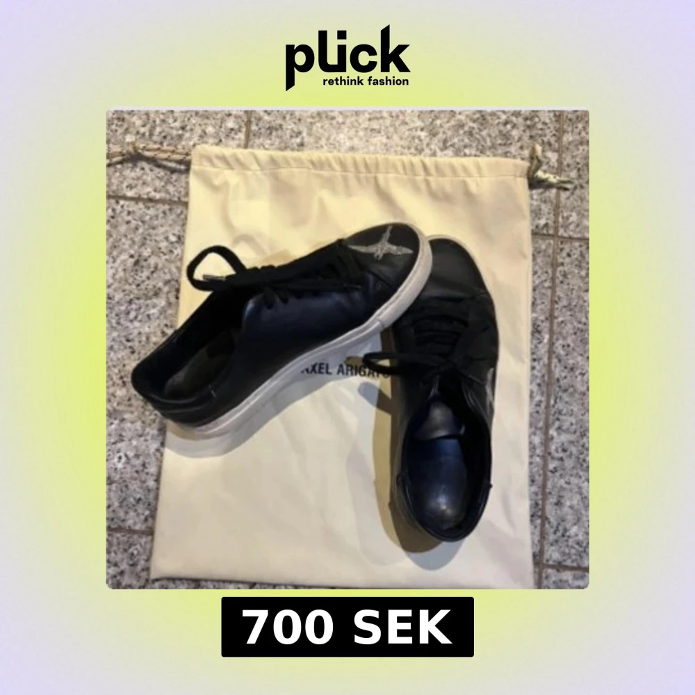Snygga svarta sneakers från Axel Arigato med vita fågeldetaljer. Skorna har en klassisk design med snörning och en vit sula. Köpte dessa för 2500kr och säljer de för 700