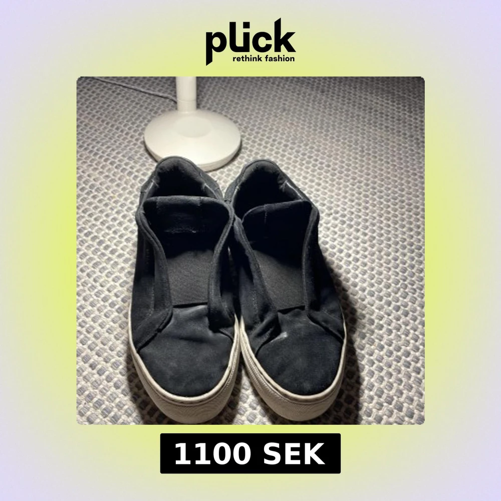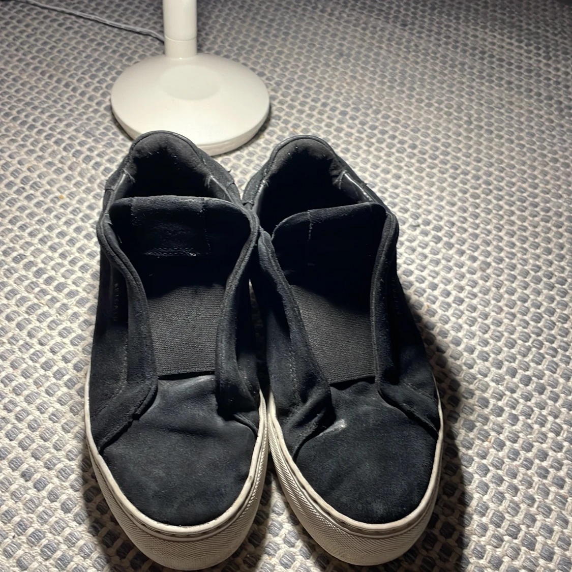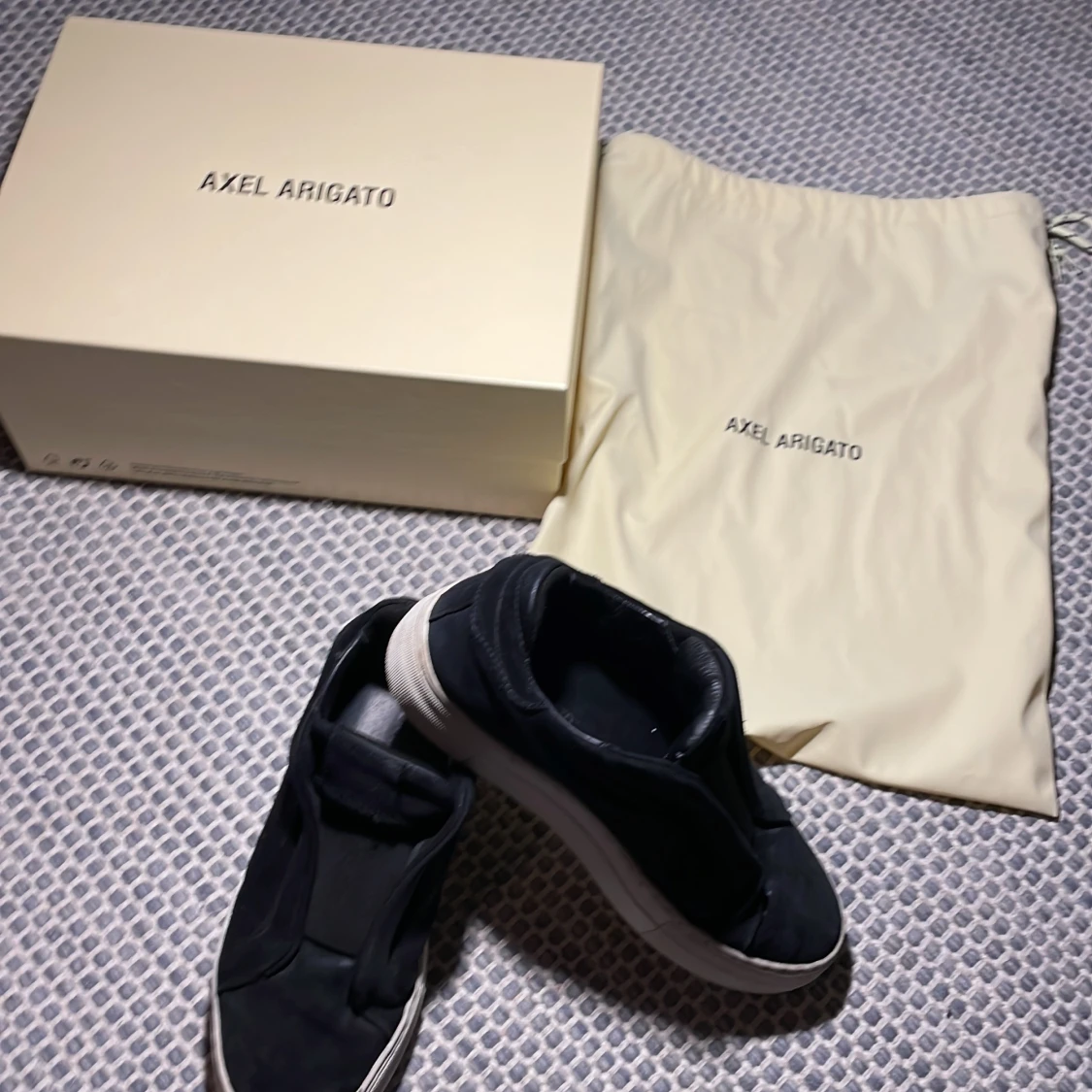Säljer ett par svarta sneakers från Axel Arigato med vit sula. Skorna har en stilren design utan snörning, vilket gör dem enkla att ta på och av. Perfekta för en avslappnad stil.